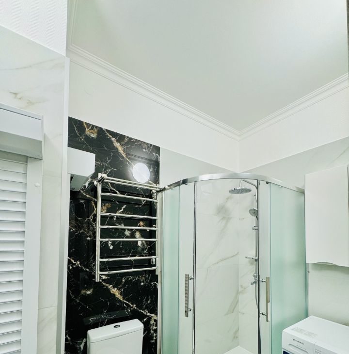 Дорогие материалы и отделка в спальне пол натуральное дерево, в ванной комнате пол и стены мрамор, высокие потолки 4 м