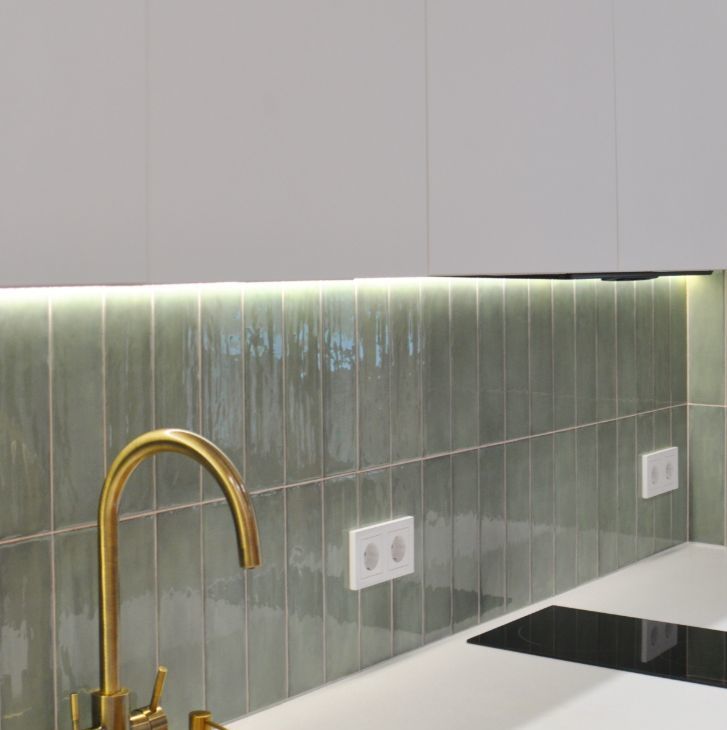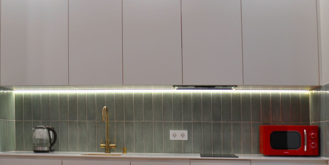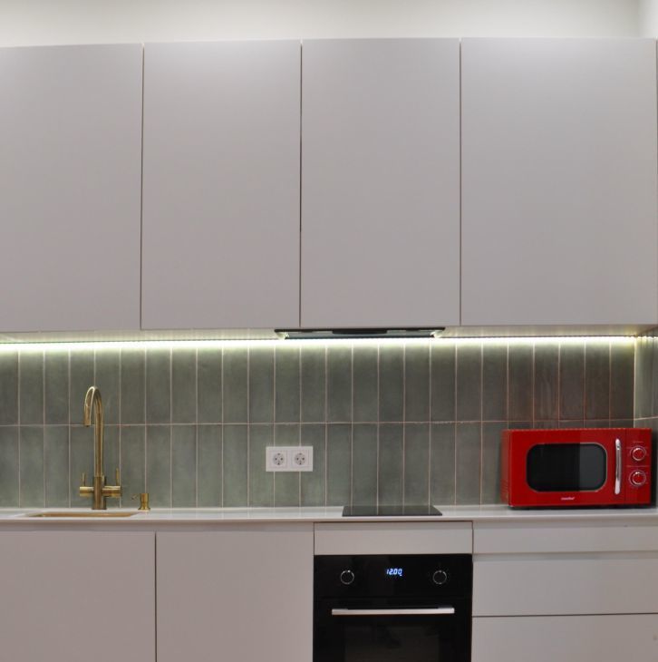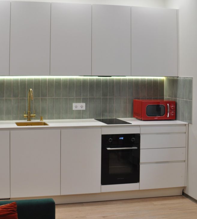Кухня оснащена посудомоечной машиной, индукционной варочной поверхностью, духовкой, холодильником, чайником, микроволновой печкой, фильтром для воды.