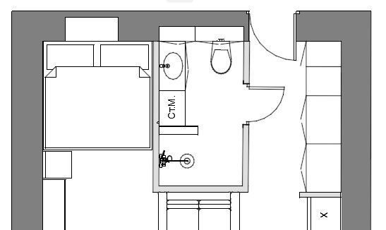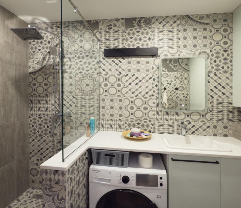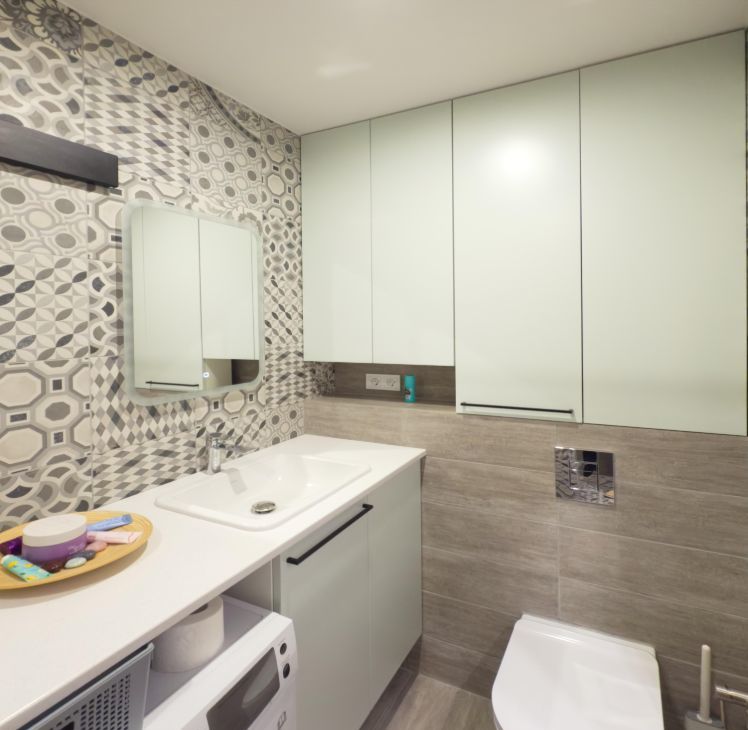 Санузел облицован плиткой, установлена душевая кабина, подвесной унитаз, гигиенический душ, стиральная машина, встроенные шкафы. Все новое.