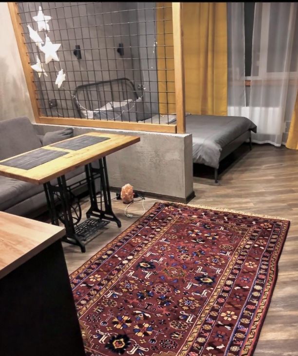 Студия визуально разделена дизайнерской перегородкой на две полноценные зоны:
