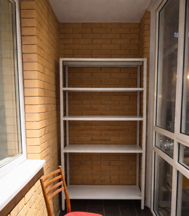 — лоджия с окнами в пол и полками для хранения