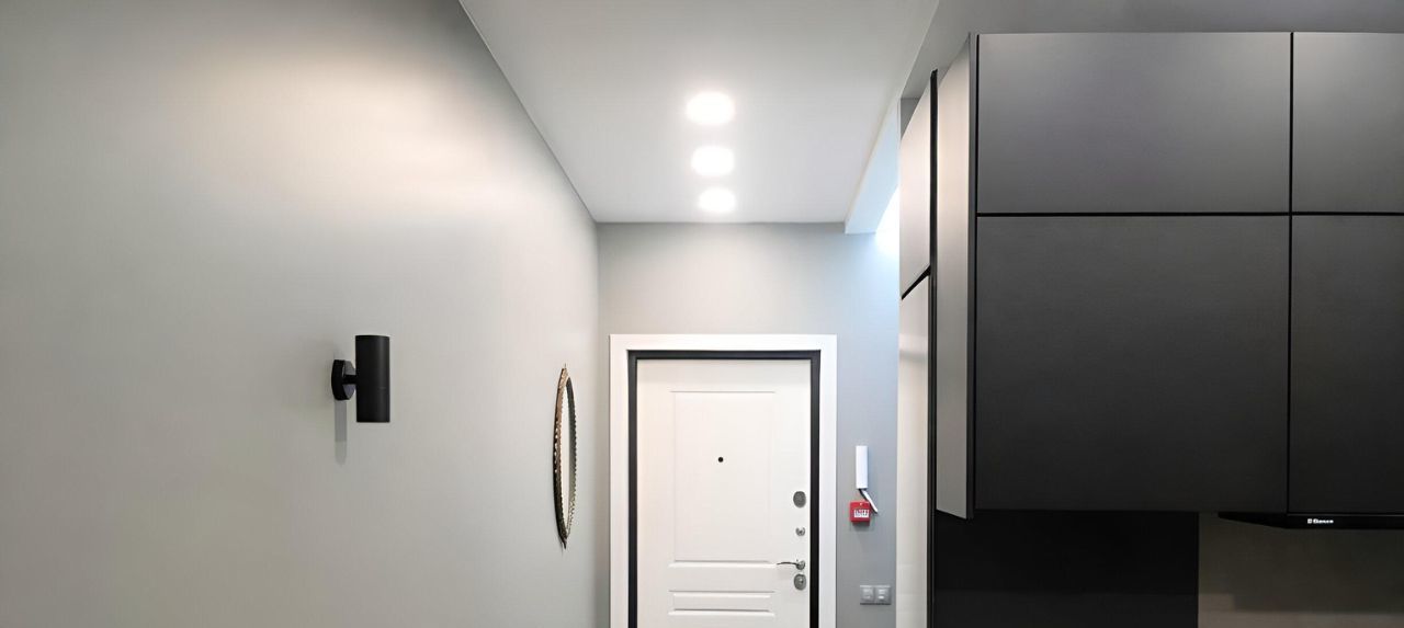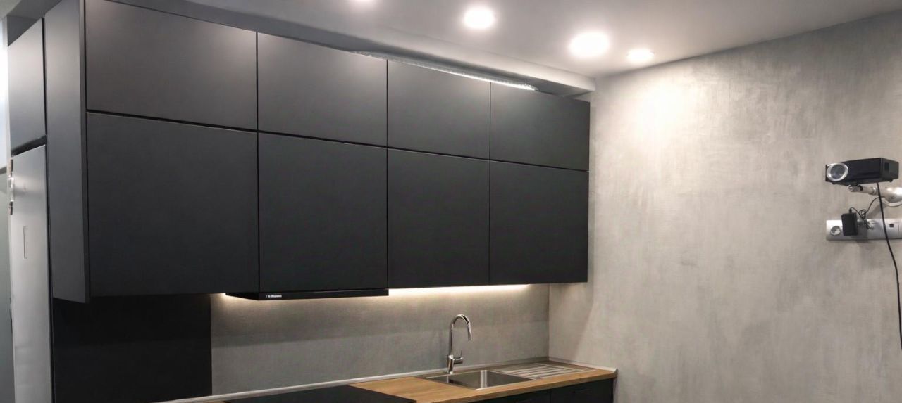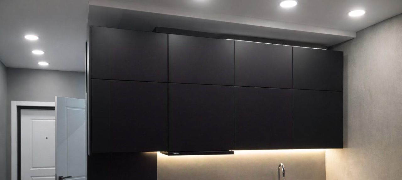 Современный интерьер в минималистичном стиле: тёмная кухня, дерево, аккуратная подсветка, продуманное освещение.