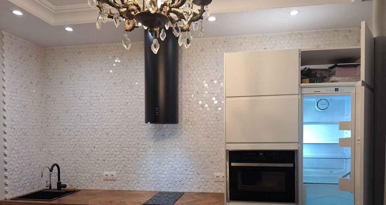 В квартире есть вся бытовая техника: стиральная, посудомоечная машины, холодильник, духовка, плита, вытяжка, кондиционер.