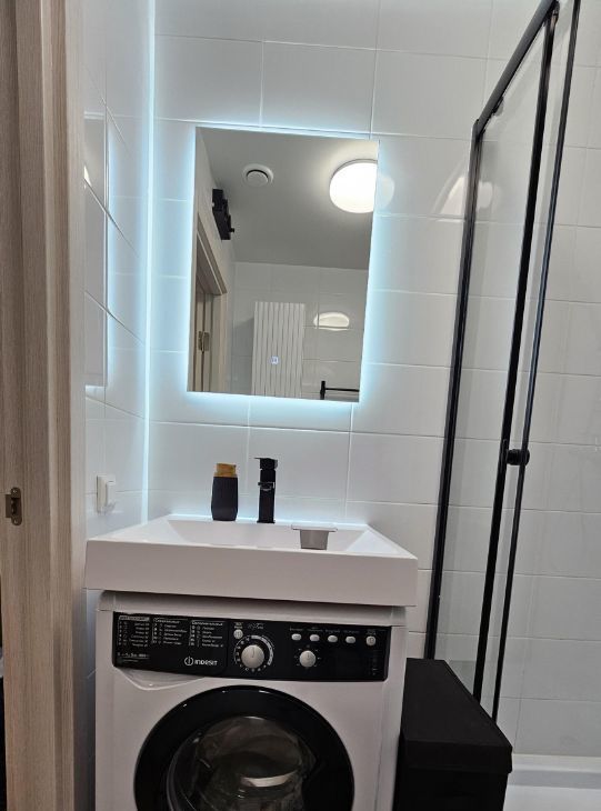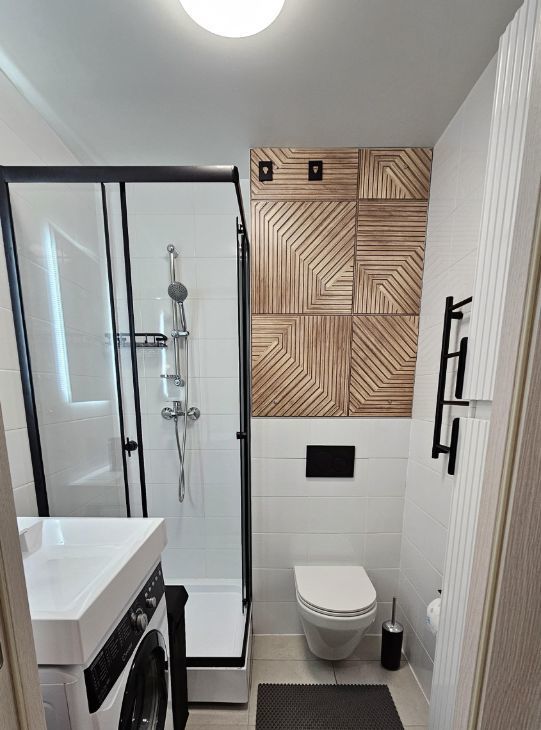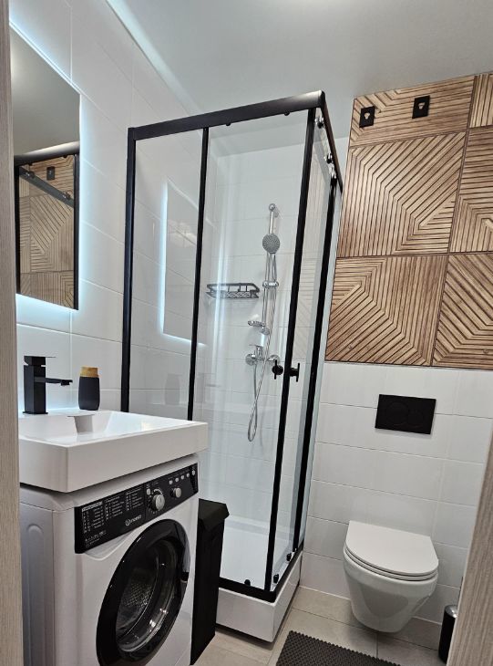 санузел оснащен душевой кабиной со слайд-двереми, унитаз с инсталяцией