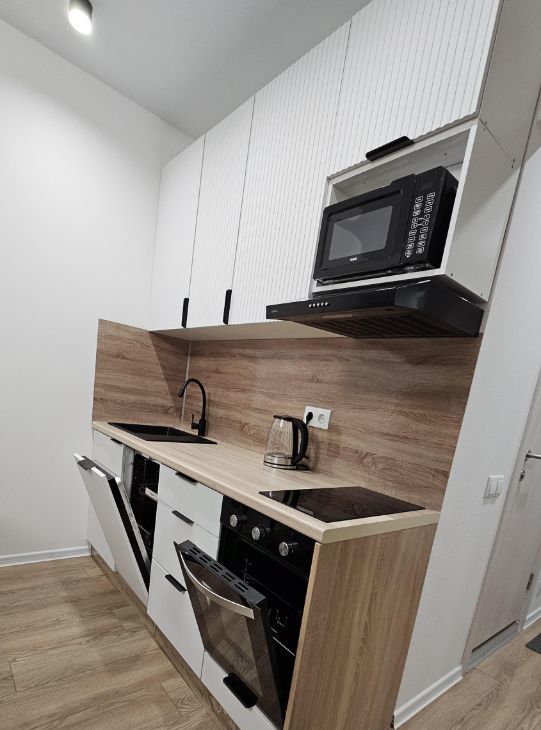 cовремeнная куxня cо встроенной техникой (посудомоечная машина, духовой шкаф, стеклокерамическая плита, микроволновка, высокий вместительный холодильник, гибкий кран)