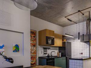 На первом этаже дома расположена кофейня-пекарня, можно спуститься "в тапочках" перекусить и выпить чашечку кофе.