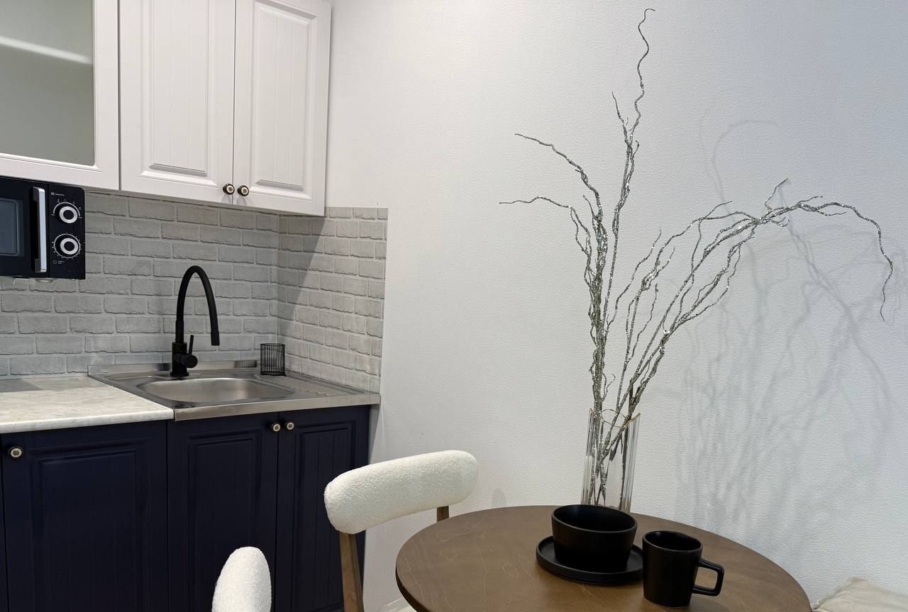 Готовить любимые блюда в компактной, но полностью оснащённой кухне — бытовая техника и все необходимое уже готовы к использованию.