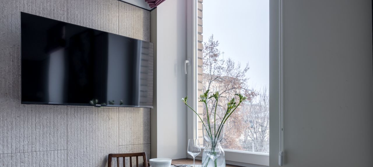 Стильные апартаменты-студия в самом центре Москвы, в пешей доступности от станции метро Маяковская. Студия полностью реновирована и оформлена в современном стиле с лёгким богемным настроением: натуральные фактуры, мягкое освещение и продуманные интерьерные детали создают атмосферу уюта и приватности в центре города. Из окон открывается вид на классический портик здания Чешского посольства.