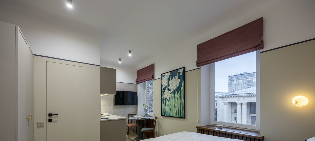 Дизайнерская студия с видом на классическую архитектуру в центре Москвы, 6 минут пешком от м. Маяковская.