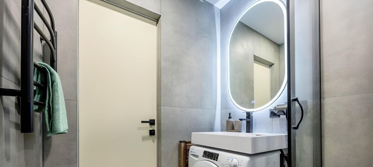 Интерьер выполнен в светлых нейтральных тонах с использованием качественных отделочных материалов и дизайнерского освещения.