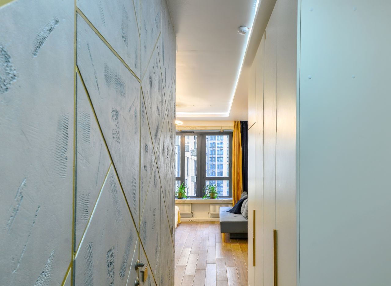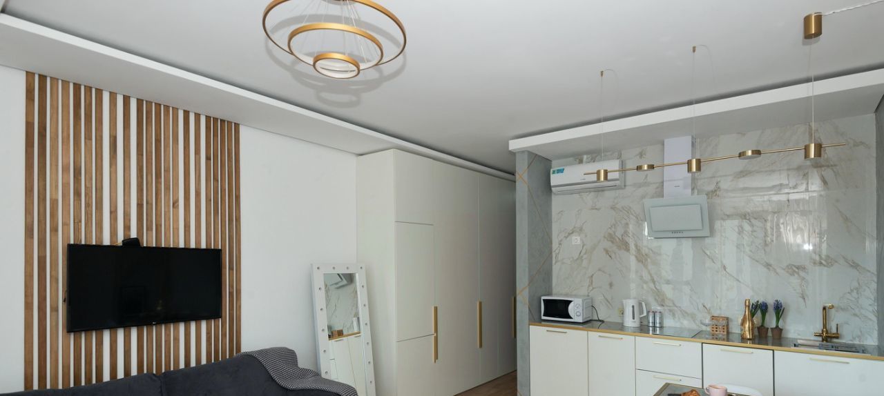 В квартире сделан евроремонт, поэтому обстановка выглядит стильно и современно. Пространство грамотно зонировано, а кухня оборудована всей необходимой мебелью. В студии установлены кондиционер, холодильник, телевизор, посудомоечная и стиральная машины. Ванная комната оснащена ванной, а санузел совмещенный.