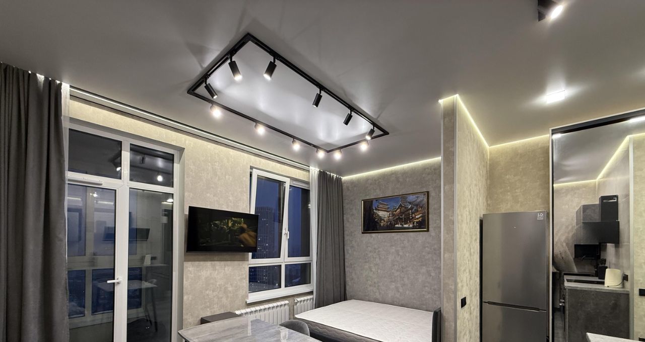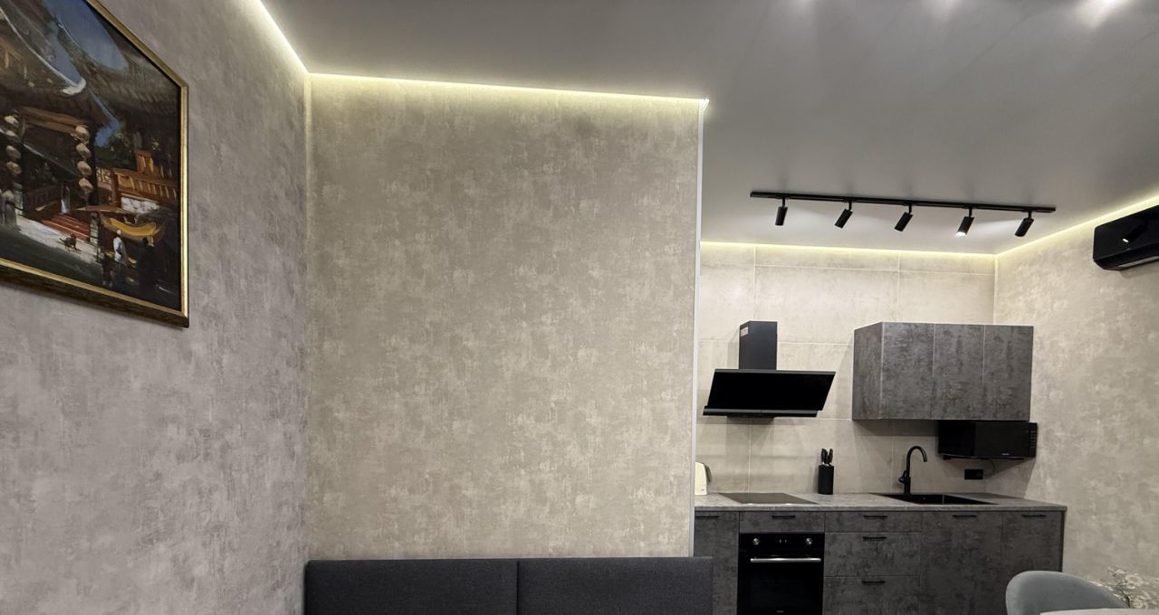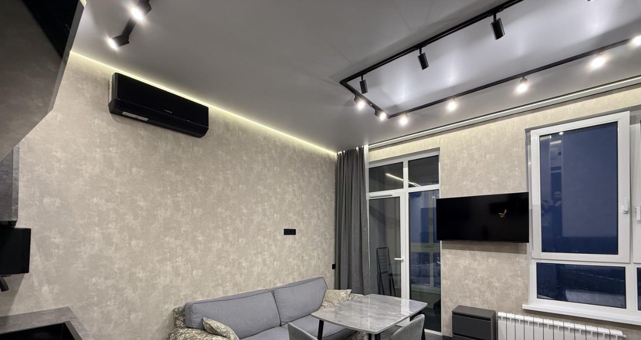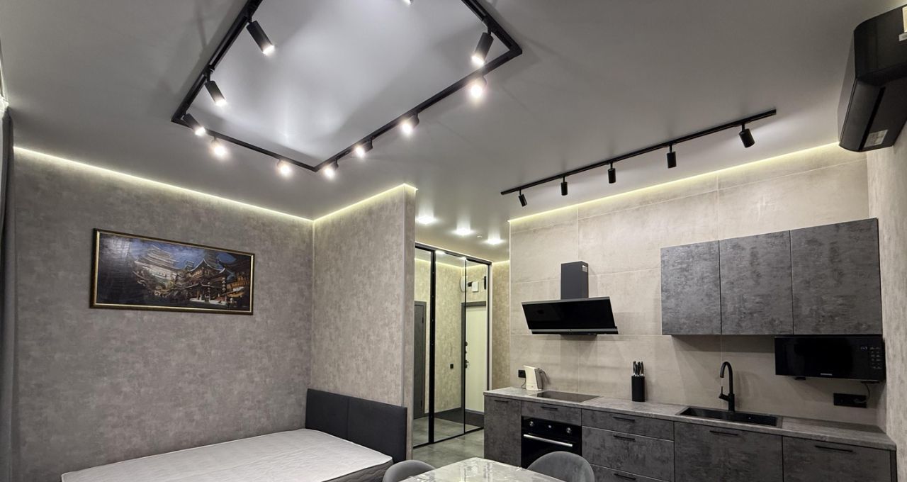 В квартире выполнен дизайнерский ремонт: высокие потолки 3.1 метра создают ощущение простора, а окна, выходящие на улицу, обеспечивают много естественного света. Жилая площадь в 16 кв. м и кухня в 7 кв. м оформлены с учётом всех современных тенденций. В кухне и комнате есть вся необходимая мебель. Для вашего комфорта установлена вся необходимая техника: кондиционер, холодильник, посудомоечная и стиральная машины, а также телевизор. В ванной комнате — современная душевая кабина.