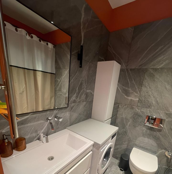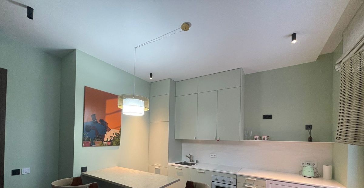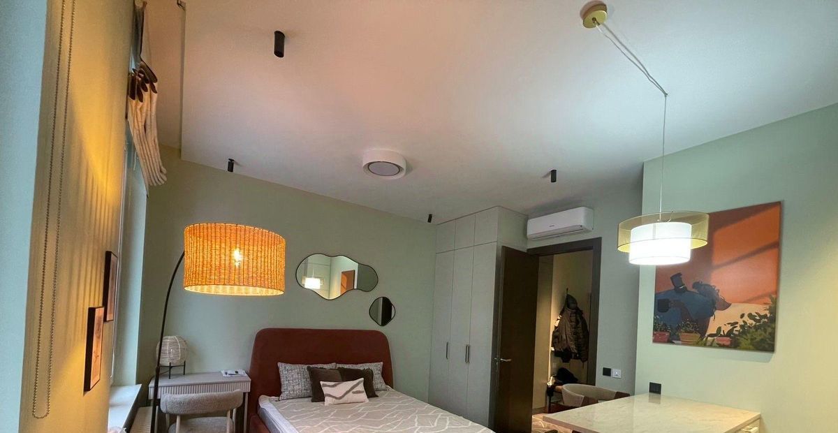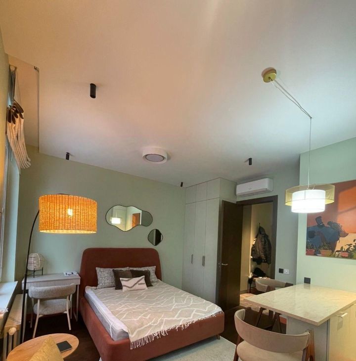 Двухспальная кровать, кресло, рабочий стол, кухня со столешней из камня и посудомойкой, стиральная машинка с функцией сушки. Умный дом