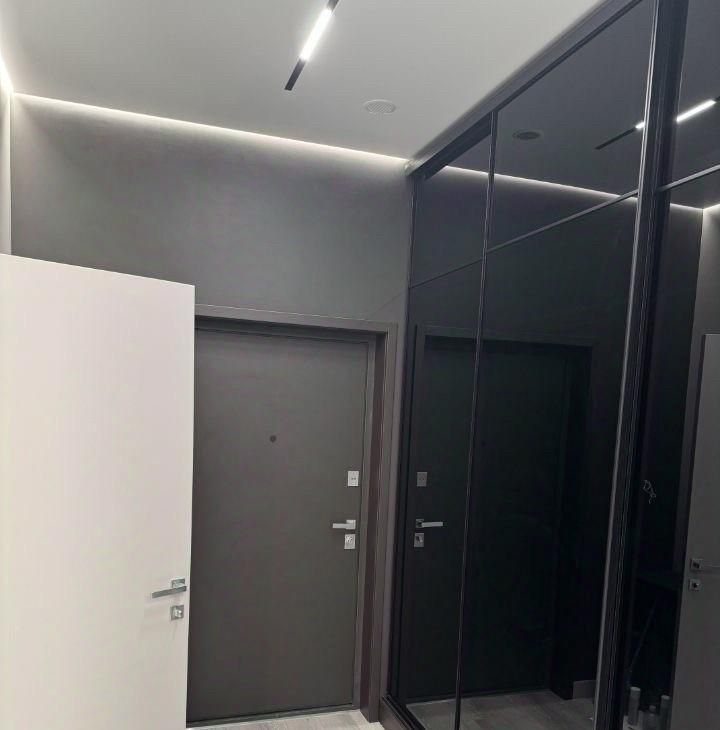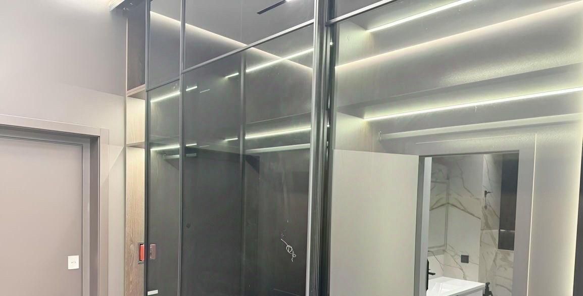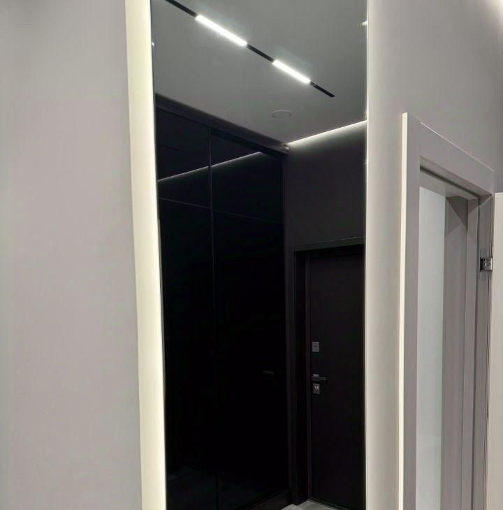 4. Прихожая: Просторная зона с затемнеными шкафами и системой хранения,с подсветкой внутри. Вид через перегородки шкафа, придает визуальное расширение пространство и гармоничное сочетание функциональности.