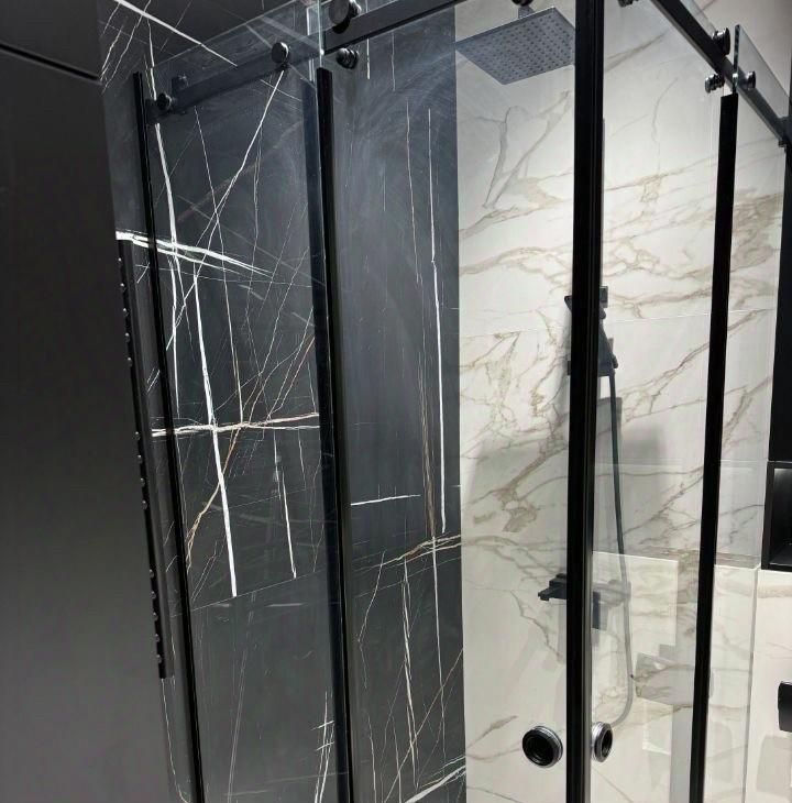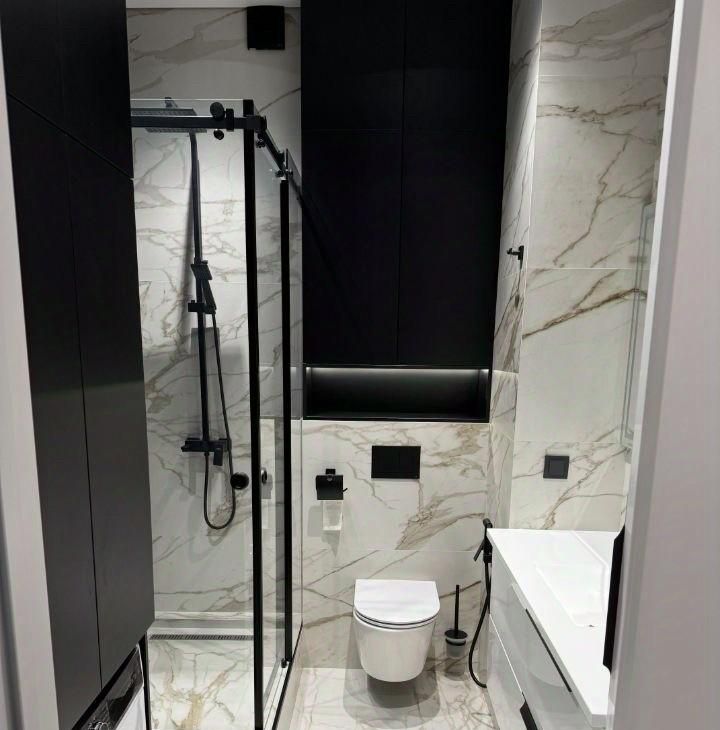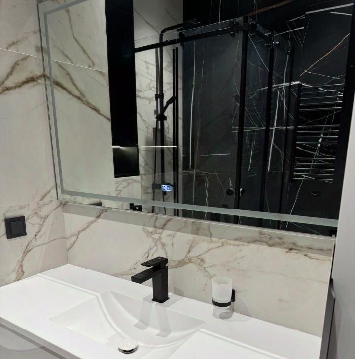 3. Санузел: Роскошный дизайн с мраморной плиткой, стеклянной душевой кабиной и хромированными деталями. Зеркалом антизапотиваниеми подстветкой.