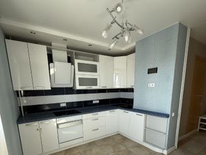 - Техника: Установлена вся необходимая встроенная техника — холодильник, посудомоечная машина, духовой шкаф, совмещенный с свч, варочная панель, вытяжка, стиральная машина, кондиционер, телевизор.