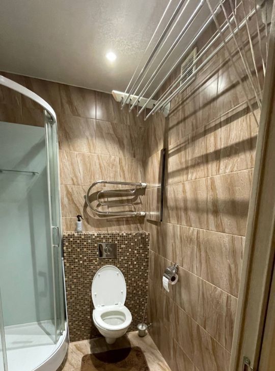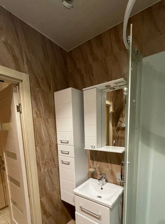 Функциональная мебель на кухне и в комнате, что позволяет сразу же заехать и жить с комфортом. Из техники есть всё необходимое: кондиционер, холодильник, телевизор и стиральная машина. Санузел совмещённый, оборудован современной душевой кабиной.