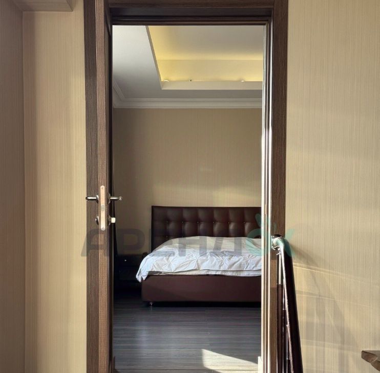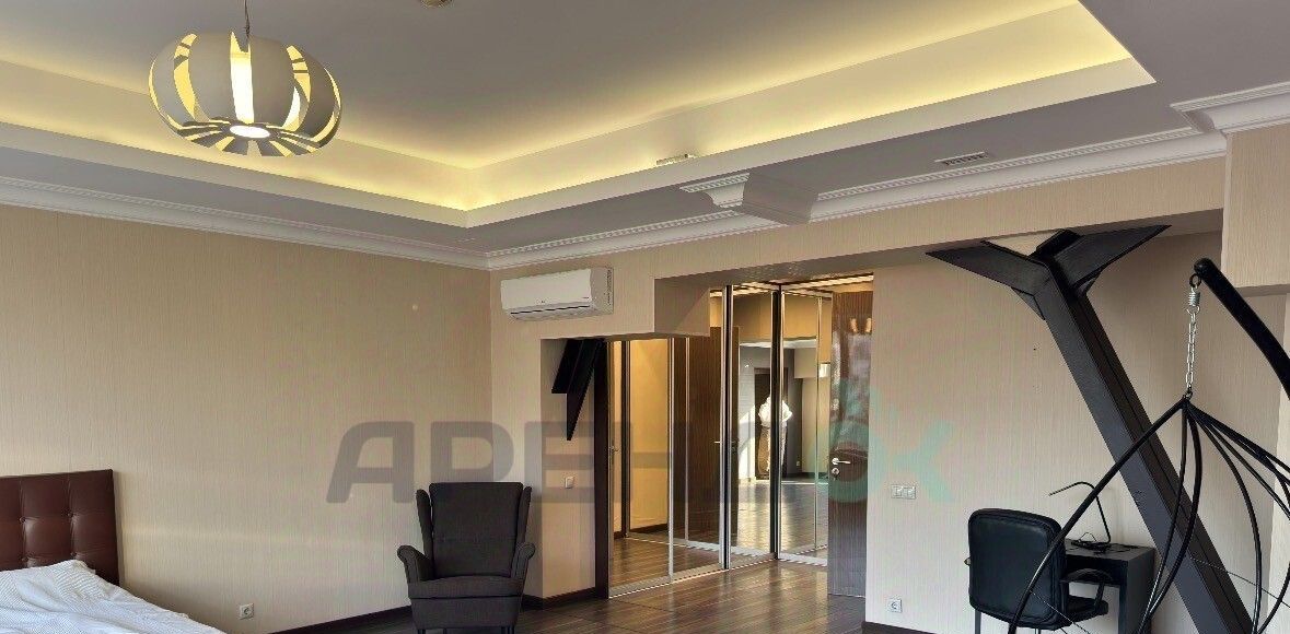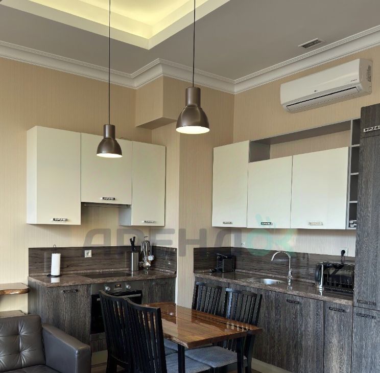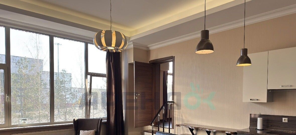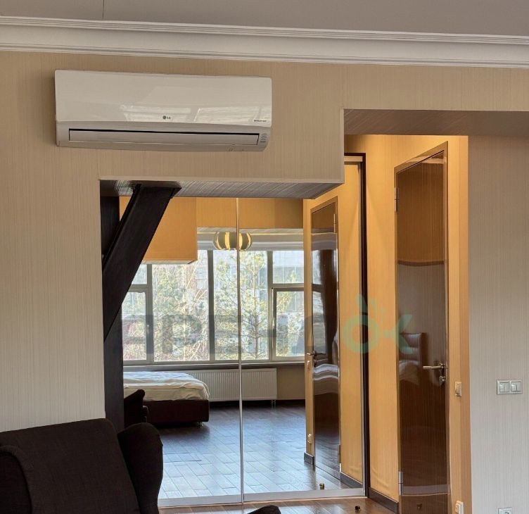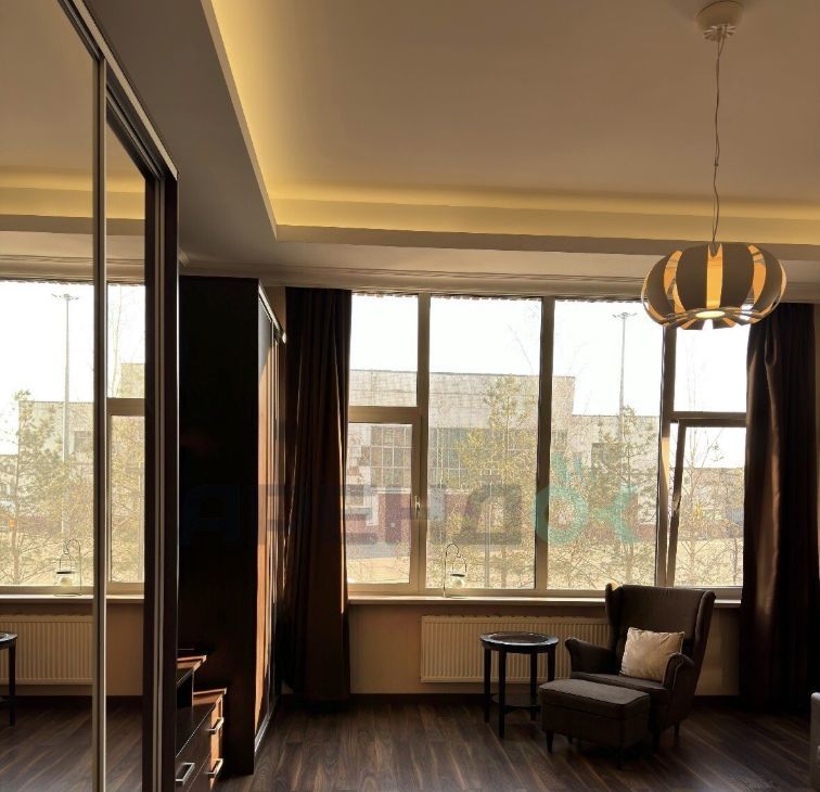 Стильная студия с панорамными окнами и вторым светом. Дизайнерский ремонт в глубоких древесных тонах. Просторная гостиная с кожаным диваном и уютным креслом для отдыха. Высокие потолки с многоуровневым освещением. Полностью укомплектована мебелью и техникой для комфортной жизни.