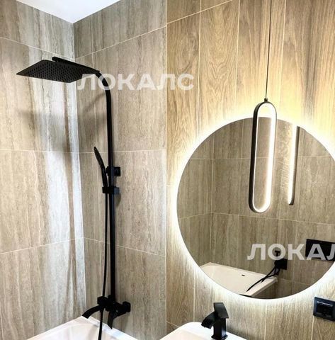 В санузле современная сантехника: гиг-душ, тропический душ, зеркало с подсветкой, реагирующей на взмах руки, большая ванна.