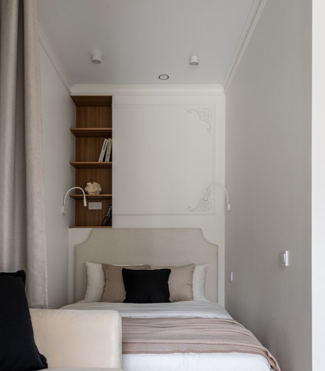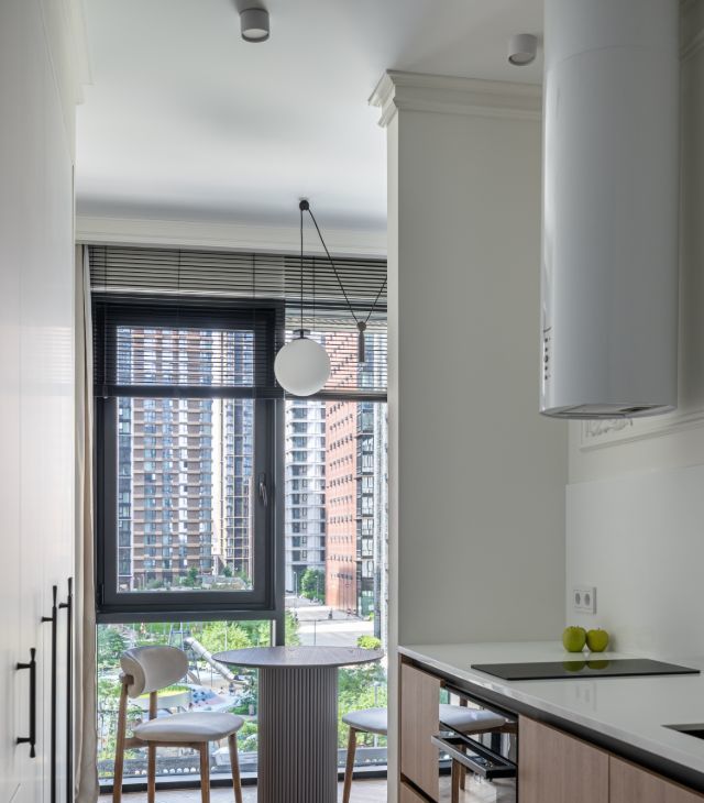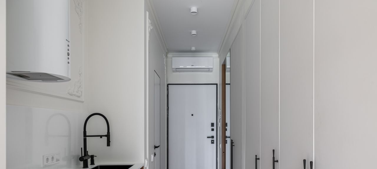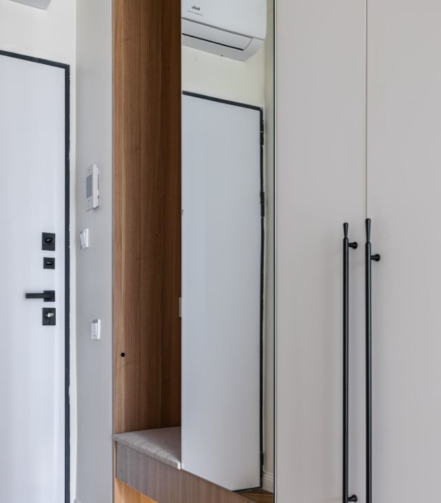 в квартире сделан дизайнерский ремонт, много мест хранения. Пространство зонировано на зону прихожей, кухни, обеденной и спальную зону.
