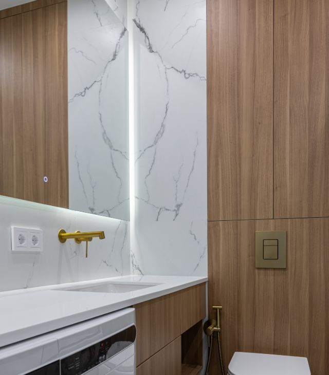 в санузле стирально-сушильная машина.