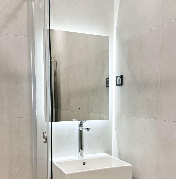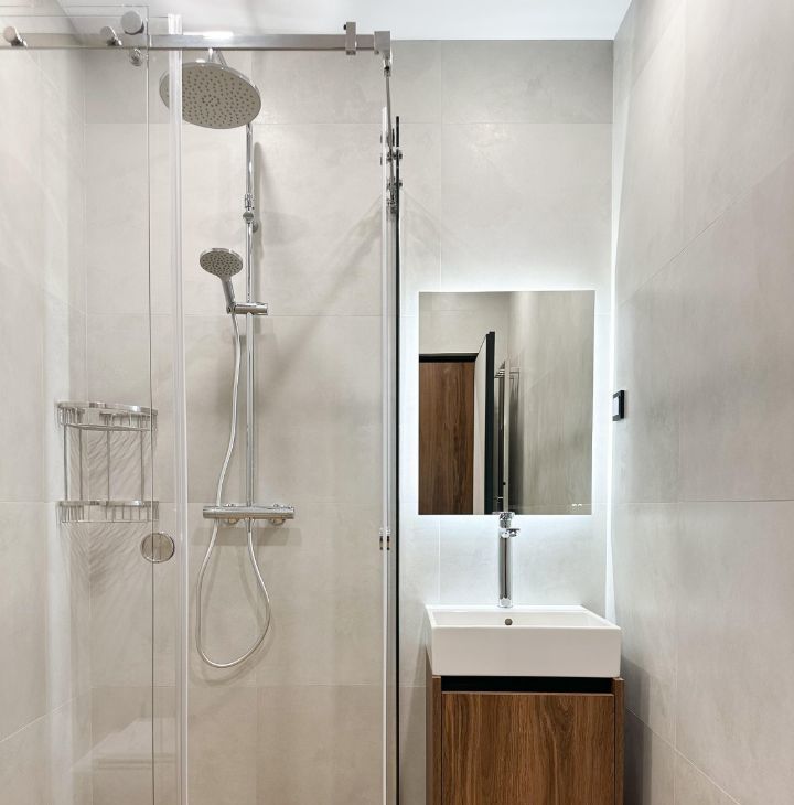 - санузел (душевая кабина, зеркало, раковина с тумбой, бойлер)