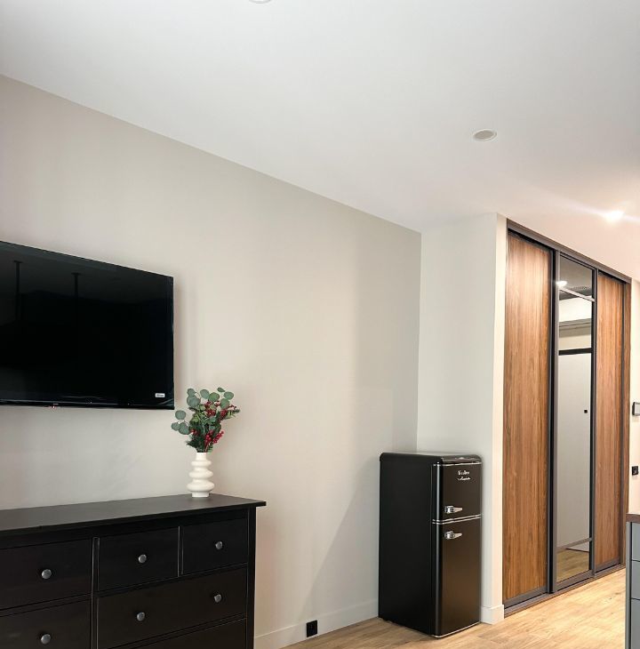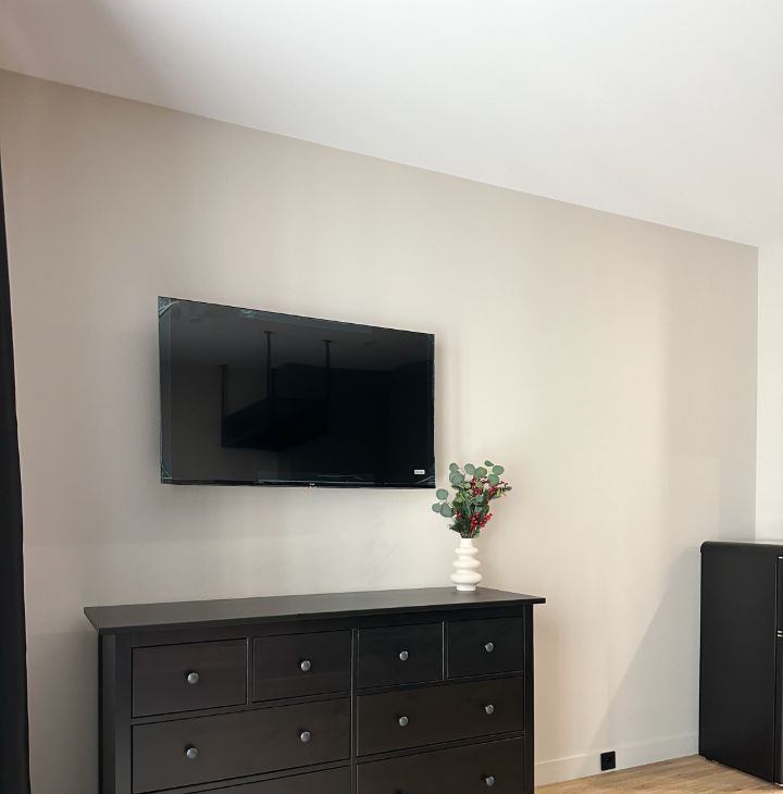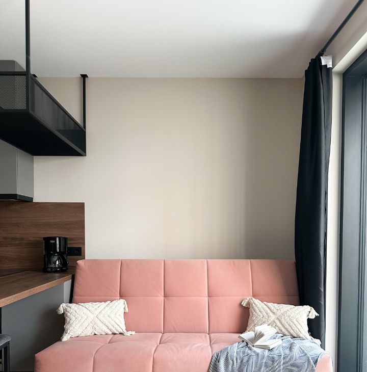 - зона для сна и отдыха (раскладной диван с местом для хранения, комплект постельных принадлежностей, телевизор, шторы блэкаут)