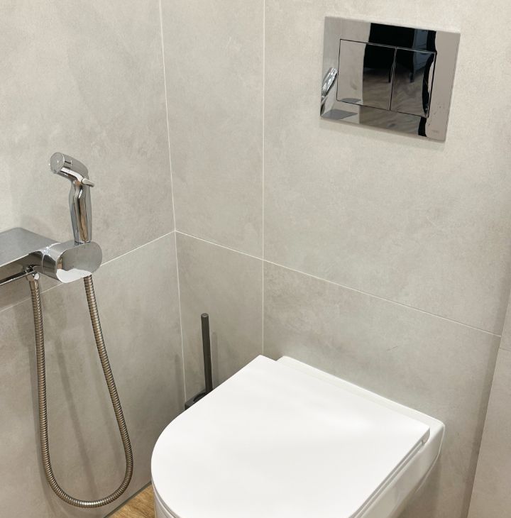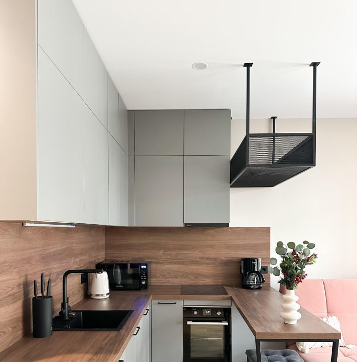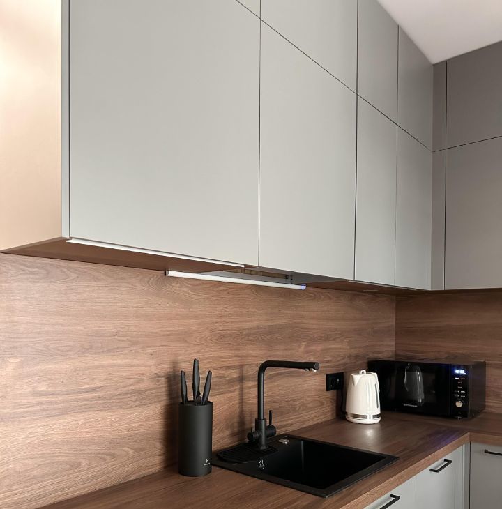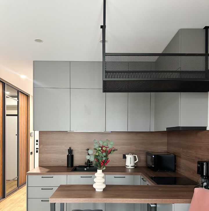 - кухня (вместительный гарнитур, СВЧ, плита с духовкой, чайник, дизайнерский холодильник, вытяжка, измельчитель мусора, фильтр для воды, ПММ, набор посуды, барная стойка и стулья)