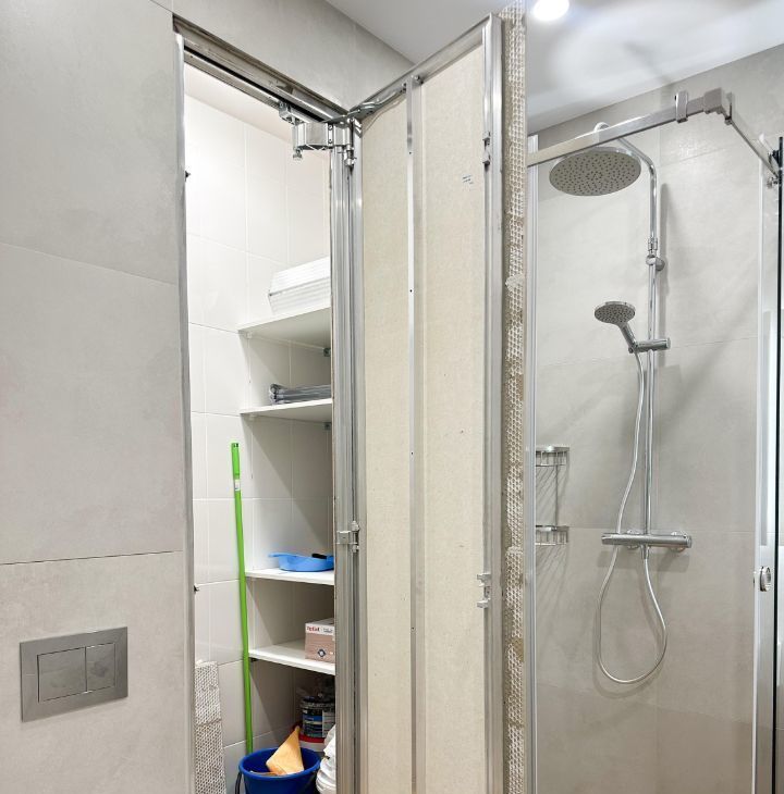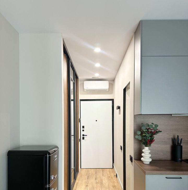 - в коридоре большой шкаф для хранения, кондиционер, стиральная машина в скрытой нише, утюг)