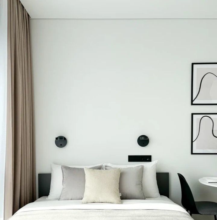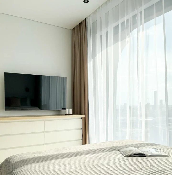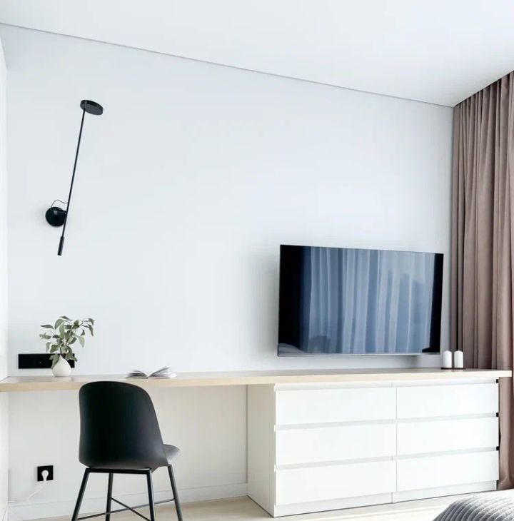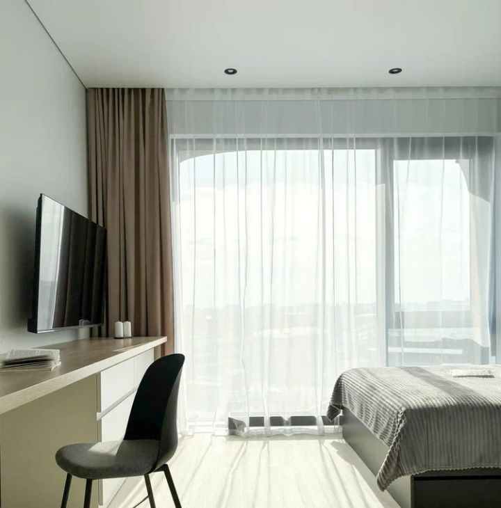 - зона для сна и отдыха (удобная двуспальная кровать, телевизор с комодом комплект постельных принадлежностей, шторы блэкаут) + рабочая зона