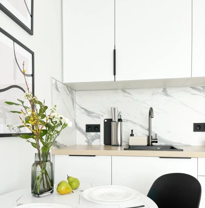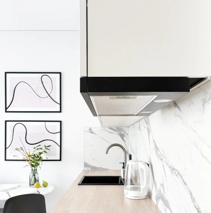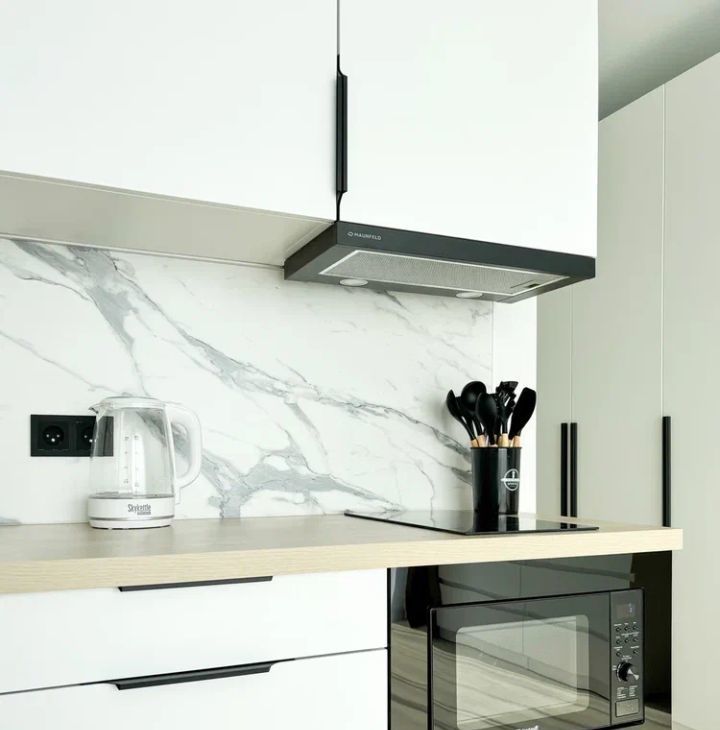 - кухня (гарнитур, СВЧ, плита , посудомойка, чайник, холодильник, вытяжка, набор посуды, стол и мягкие стулья)