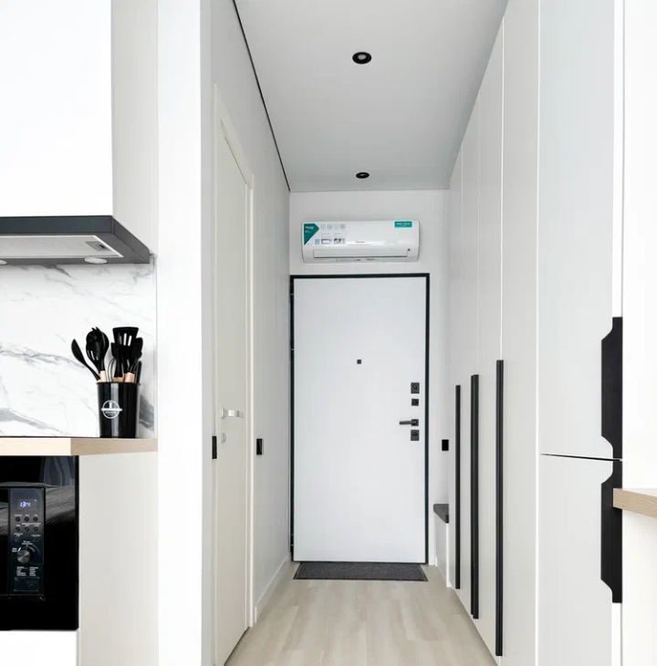 - в коридоре большой шкаф для хранения, кондиционер, банкетка.