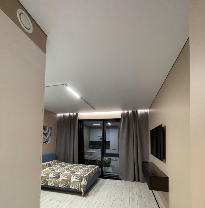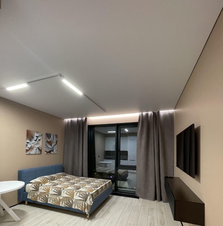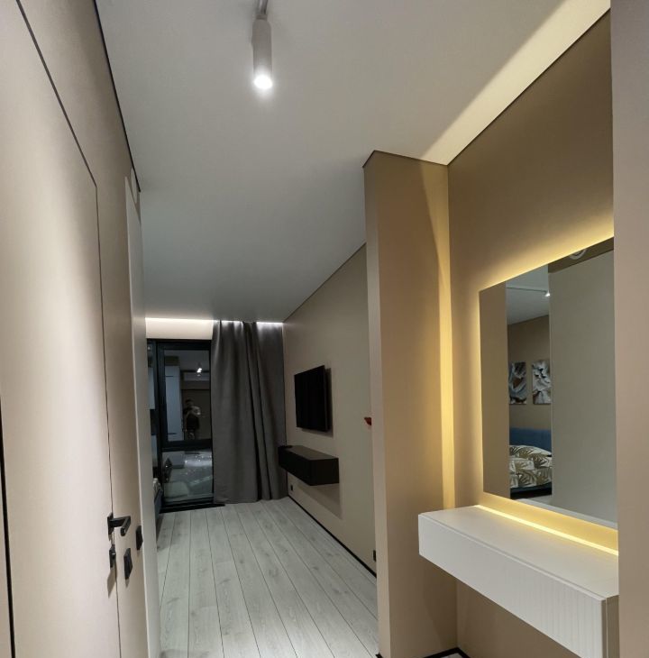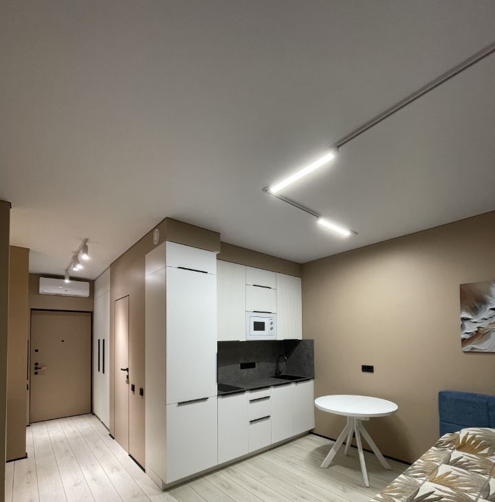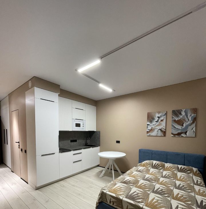 В студии выполнен дизайнерский ремонт, который создаст атмосферу уюта и комфорта. В квартире есть вся необходимая мебель как на кухне, так и в жилой зоне. Для вашего удобства установлена современная техника: кондиционер, холодильник, посудомоечная машина, телевизор и стиральная машина. Санузел совмещенный, оборудован ванной, что позволит расслабиться после долгого дня. Есть интернет, поэтому всегда можно оставаться на связи.