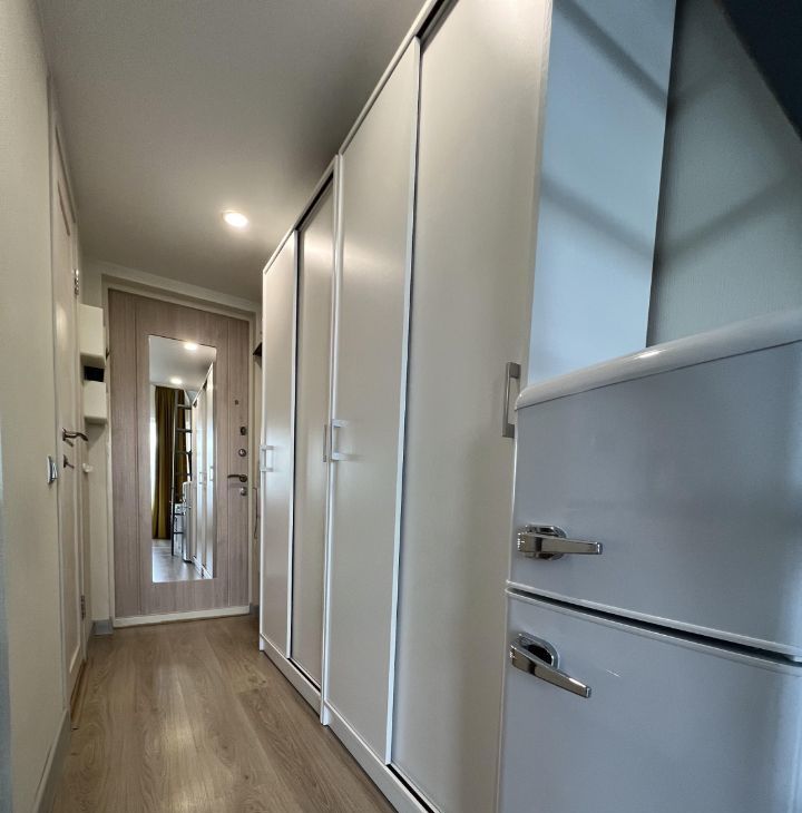 Студия мебелирована, оснащена всей необходимой техникой (телевизор, стиральная машина, холодильник, варочная панель, микроволновка, чайник).