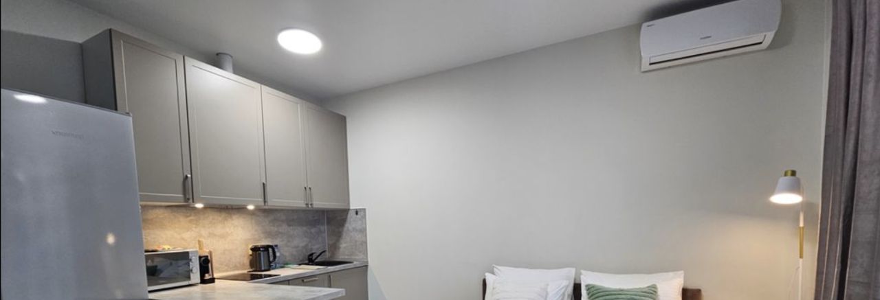 Кухня, стол, стулья и вся необходимая бытовая техника; холодильник с системой No Frost и минимальным уровнем шума , варочная панель, вытяжка,посудомоечная машина. Кондиционер. Полы с подогревом .