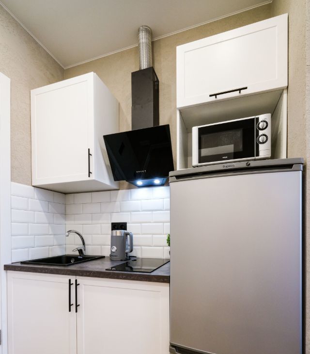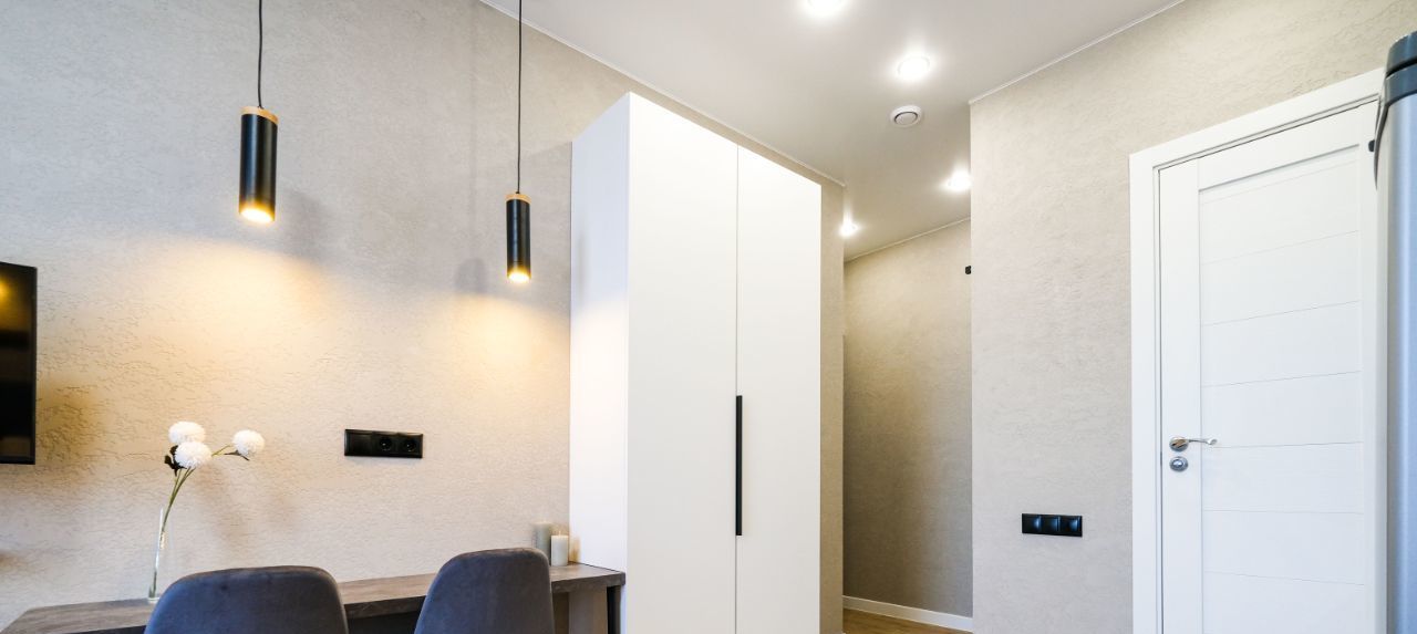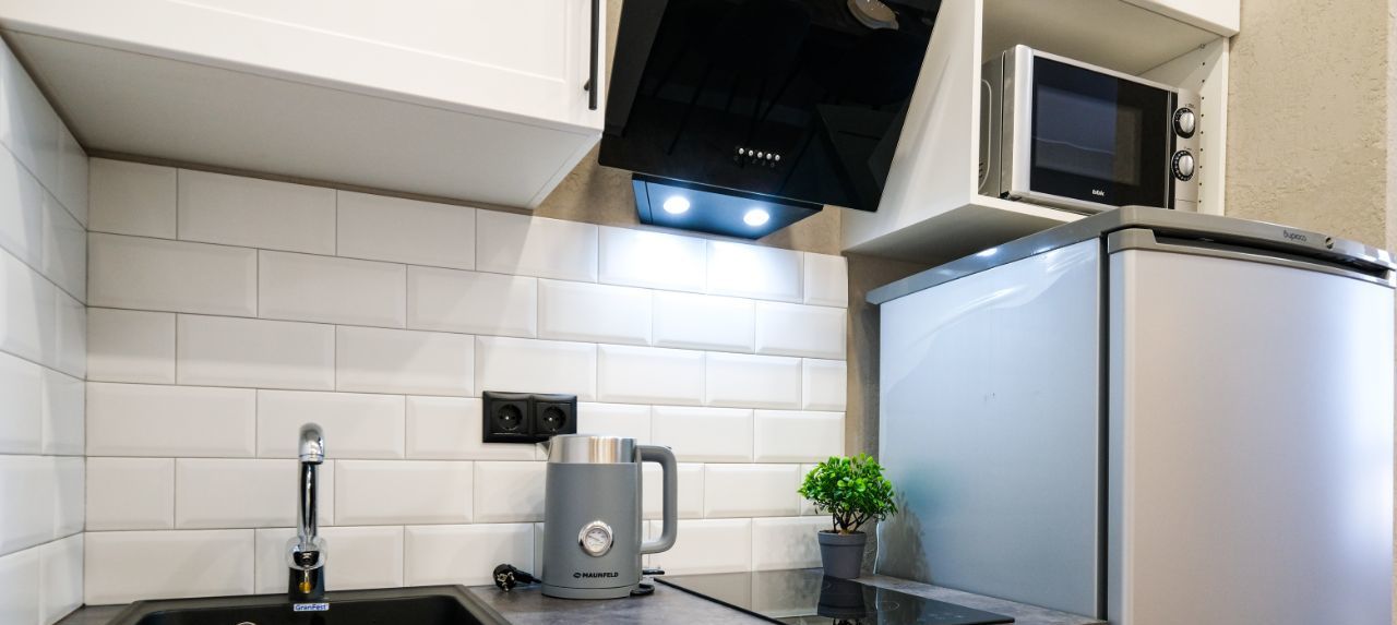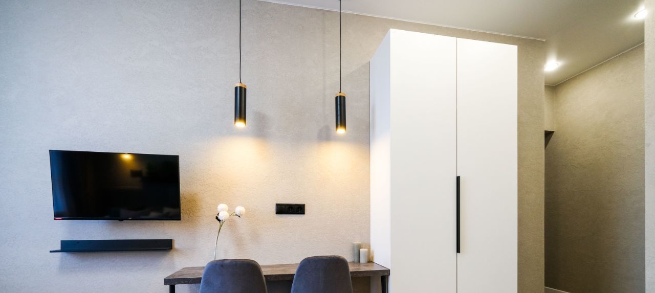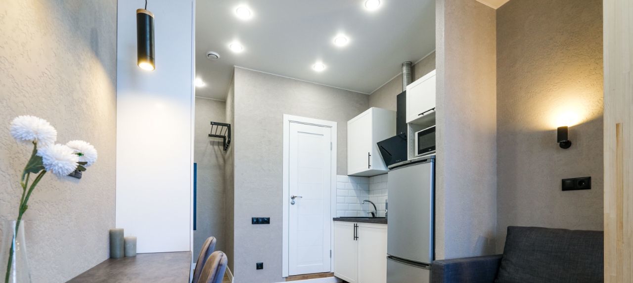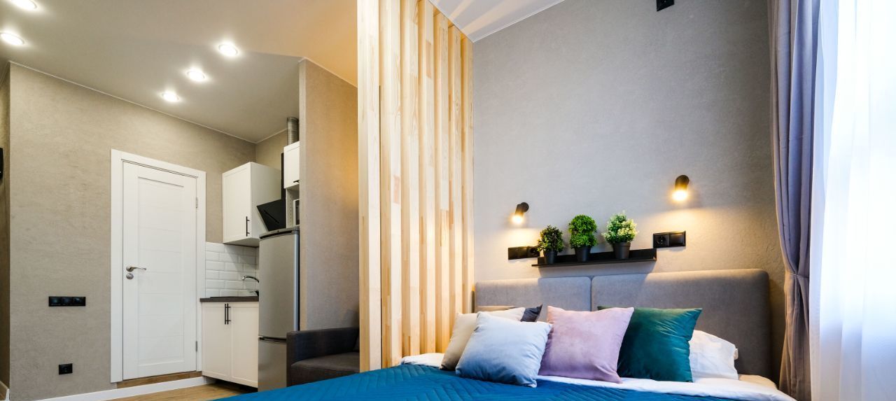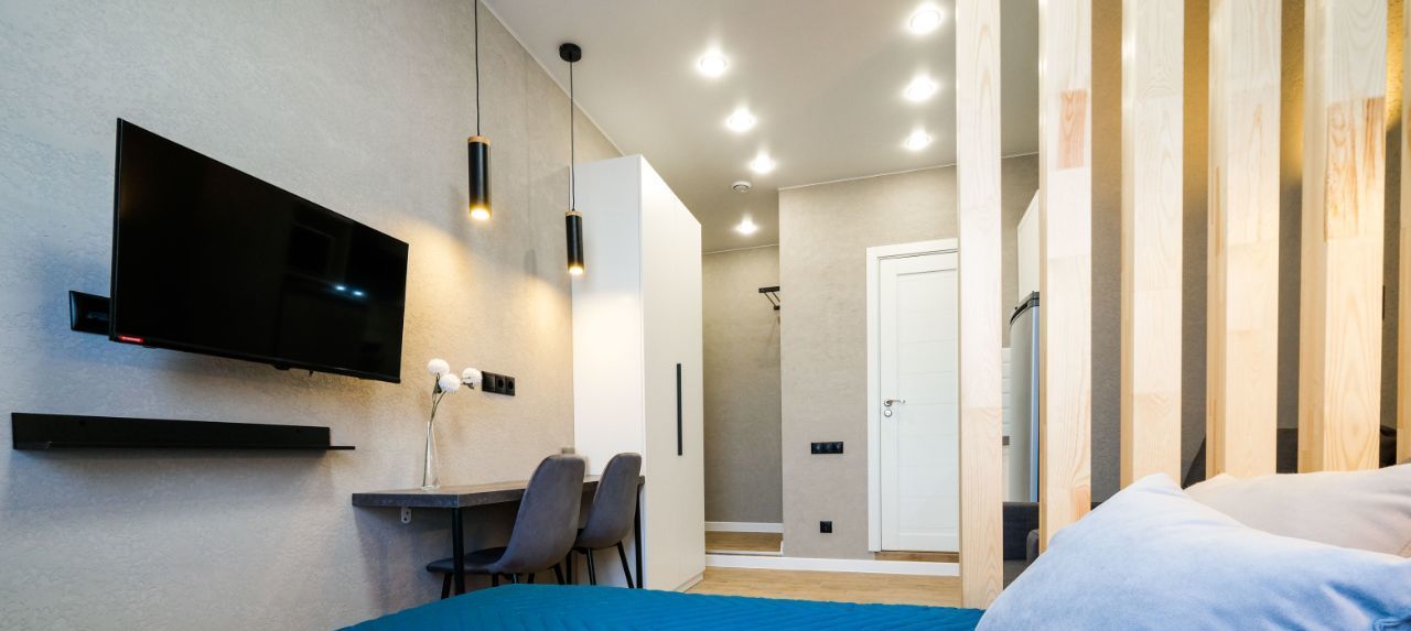 В апартаментах выполнен евроремонт, что создает современную и уютную атмосферу. Пространство студии грамотно зонировано и включает в себя жилую зону и компактную кухню с необходимой мебелью. Ванная комната оснащена современной душевой кабиной. Для вашего комфорта в апартаментах есть кондиционер, холодильник, телевизор и стиральная машина.