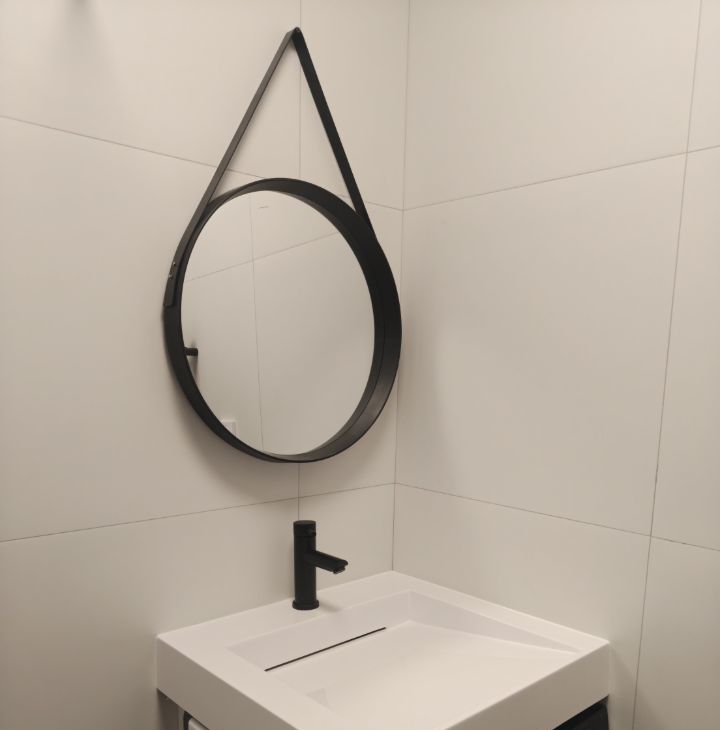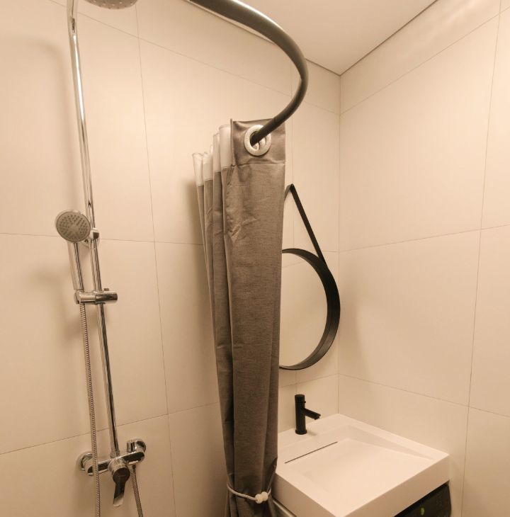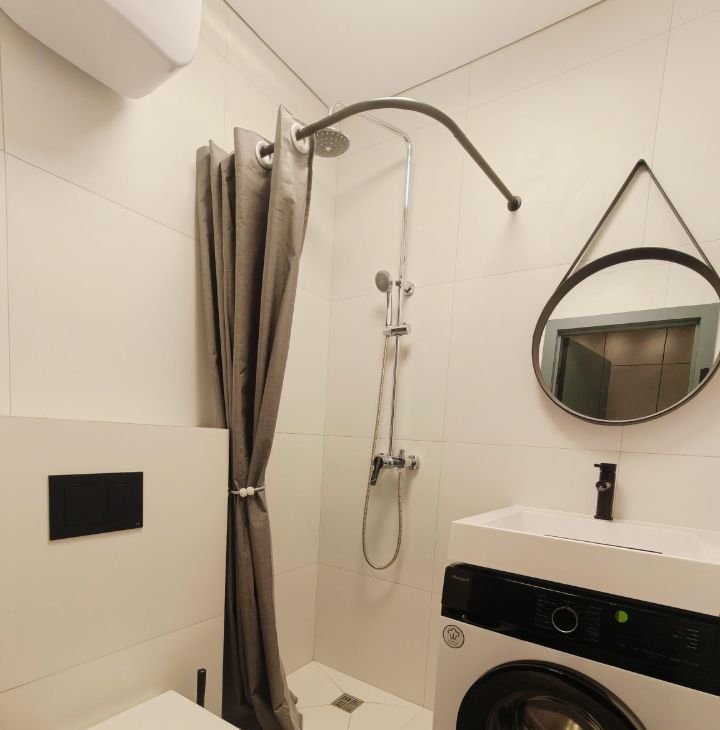 Сан узел сделан в бело-черном стиле. Стиральная машина Weisgauff, подвесной унитаз, полотенцесушитель.