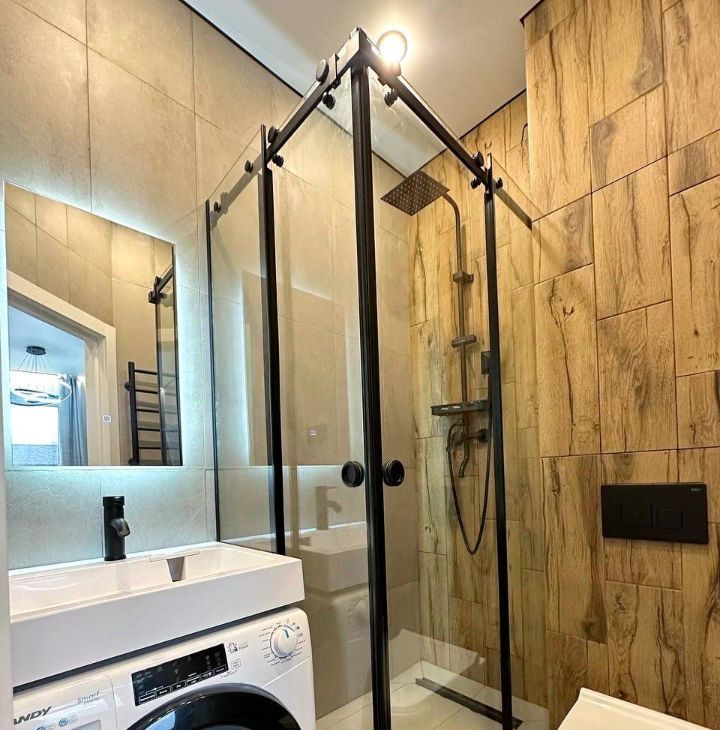 Совмещённый, с душевой кабиной и стиральной машиной.
