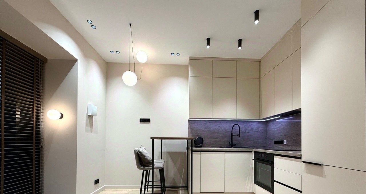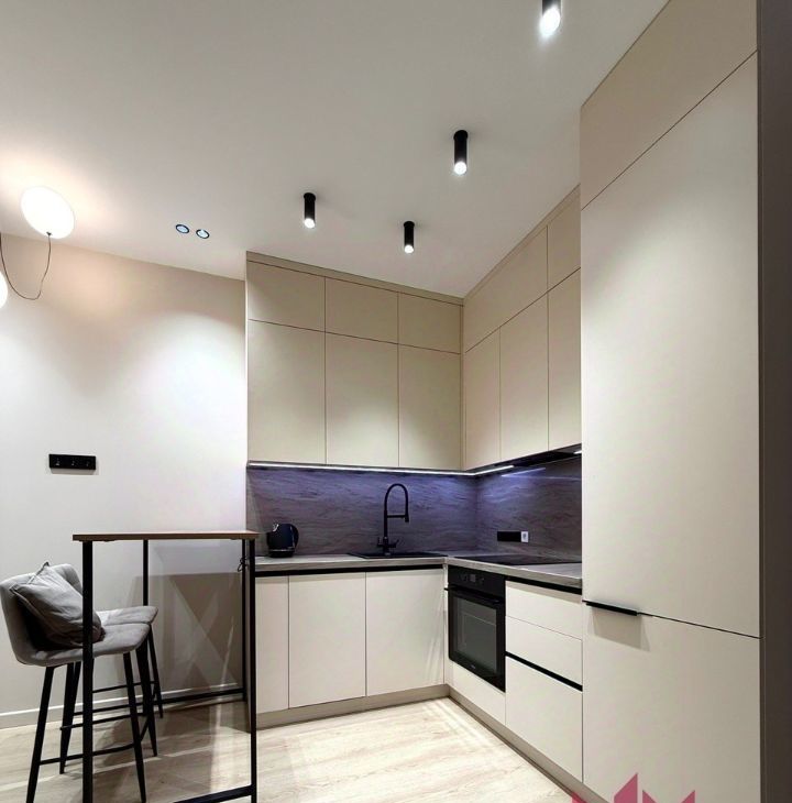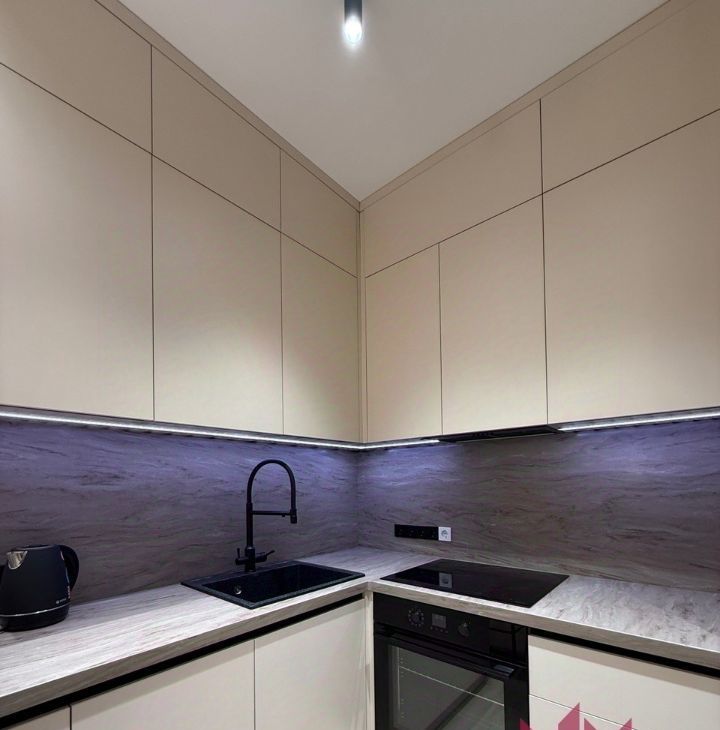 В кухонной зоне установлена качественная бытовая техника. Укомплектована индукционной плитой, холодильник, вытяжка, духовой шкаф, посудомоечная машина, вместительные шкафчики, чайник.
