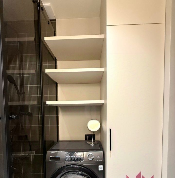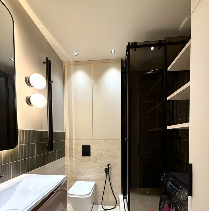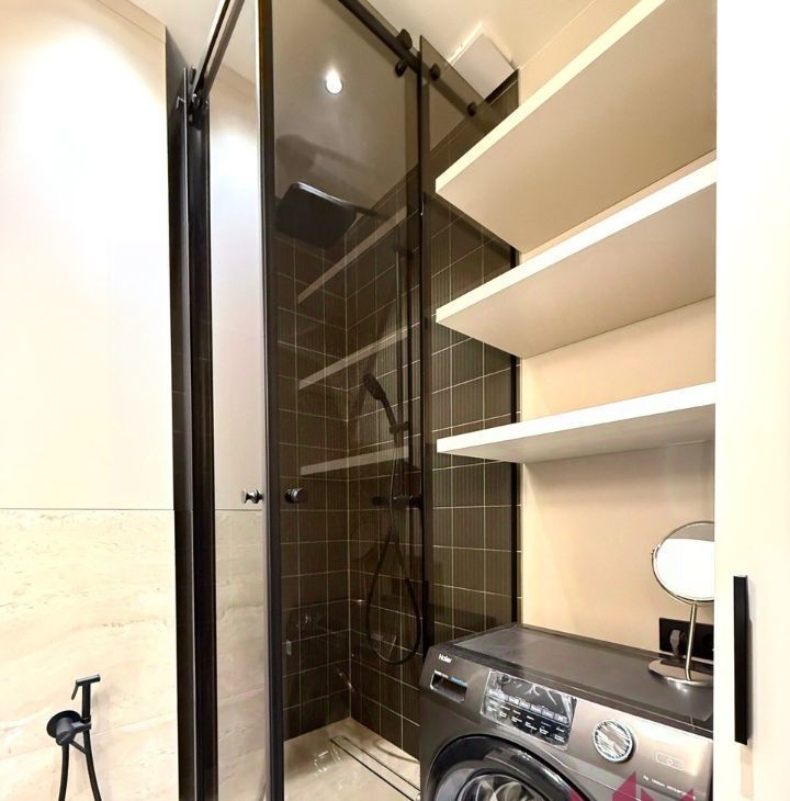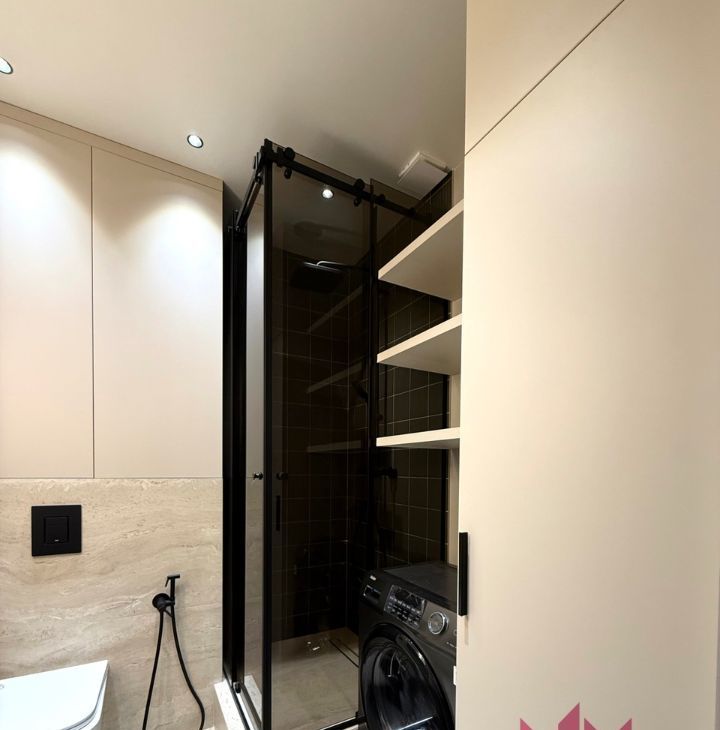 Совмещенный санузел с душевой кабиной, зеркало, полотенцесушитель, новая стиральная машина.