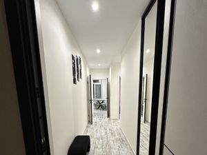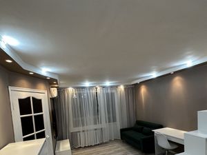 В квартире есть все необходимое для комфортного проживания. Просторная комната с мебелью, оборудованная кухонная зона, а также техника: кондиционер, холодильник, телевизор и стиральная машина. Высокие потолки (2.9 метра) и окно во всю стену создают ощущение простора. Ванная комната оснащена современной душевой кабиной.