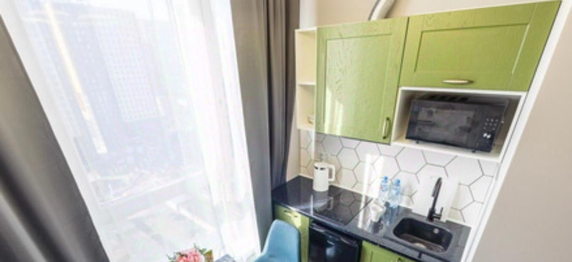 Апартамент полностью готов к проживанию: в комнате и на кухне есть вся необходимая мебель.