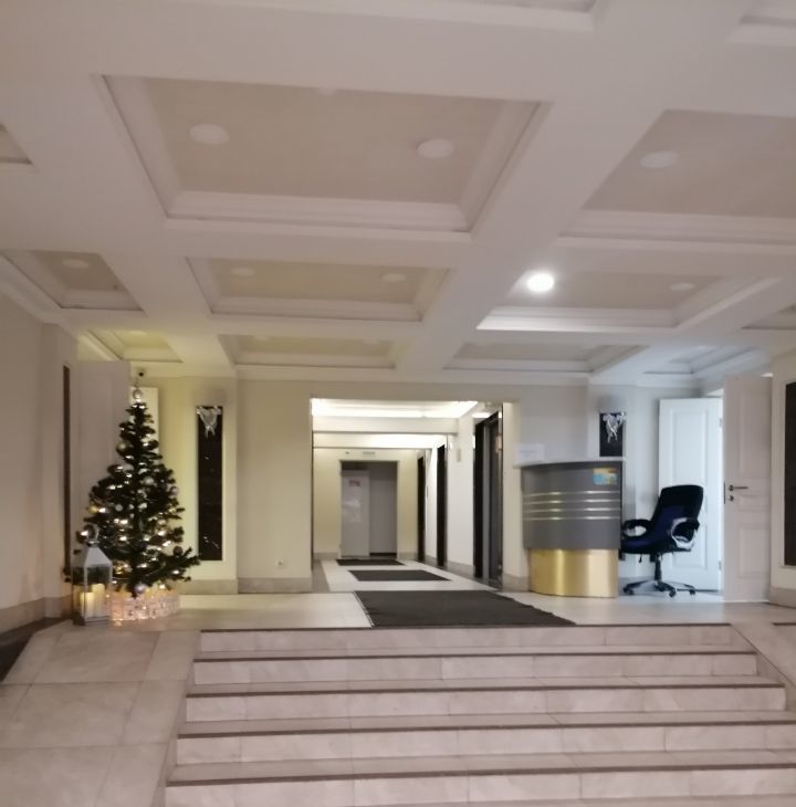 Дом безопасный: круглосуточно дежурит охрана, установлены камеры видеонаблюдения. Зайти на этаж можно только с помощью домофона или по специальному паролю. В холле расположен салон красоты и кофейный аппарат.