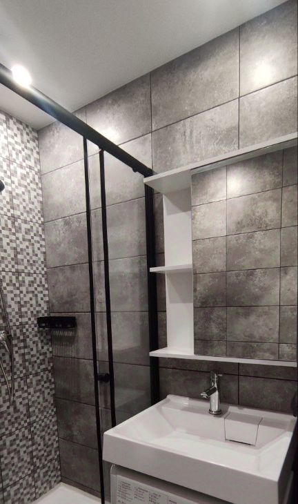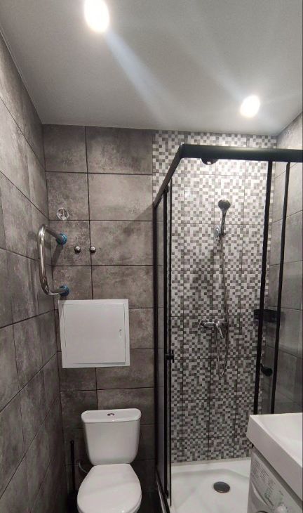 Ванная комната оборудована душевой кабиной и стиральной машиной.