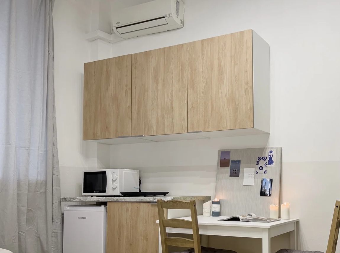 Пространство компактное, но функциональное и полностью автономное. В комнате оборудована собственная мини-кухня с электрической плитой, холодильником, микроволновой печью и чайником, есть необходимая посуда. Установлены деревянный стол и стулья, кондиционер, удобная кровать, шкаф и комод для хранения, а также зеркало в полный рост. Студия закрывается на ключ. Внутри расположен совмещенный санузел с душем и туалетом.