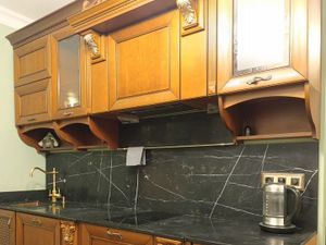 - Кухня оснащена современной техникой: посудомоечная машина, холодильник, духовой шкаф, плита, микроволновка. Также имеется телевизор.