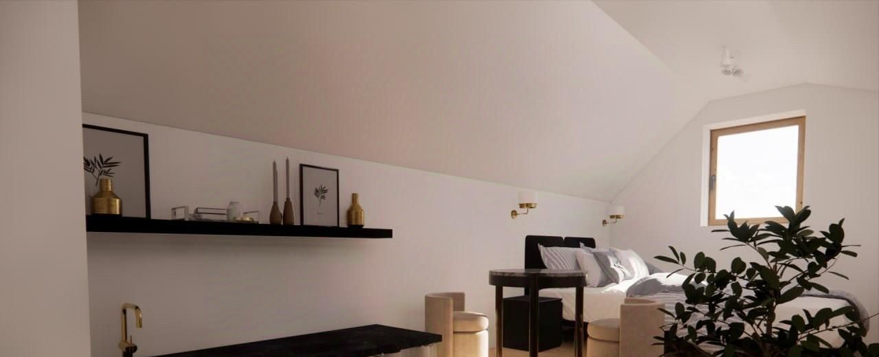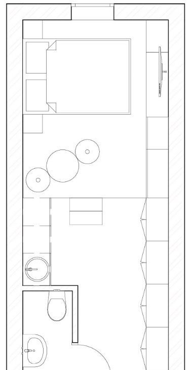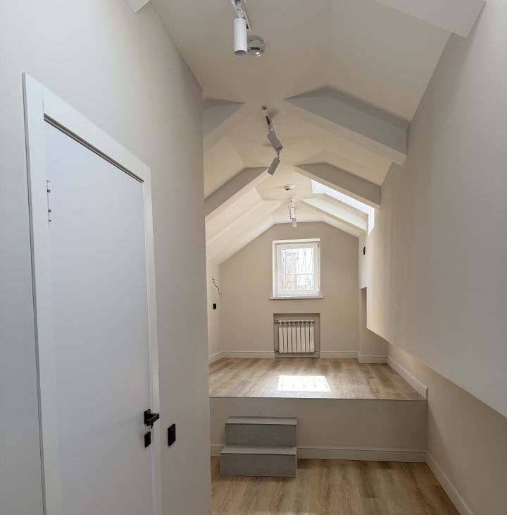 Благодаря высоте потолков 3,2 м и сводчатой конструкции, студия ощущается значительно просторнее своих 22,5 кв. м. Стильный подиум со ступенями уже создает грамотное зонирование пространства.