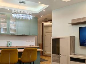 Квартира после евроремонта, полностью готова к проживанию. В комнатах и на кухне есть вся необходимая мебель, что делает её уютной и комфортной.