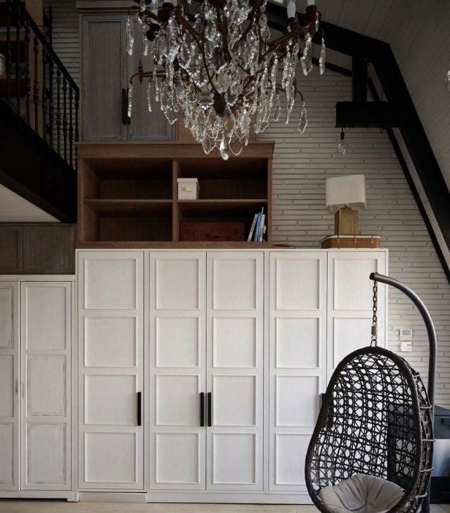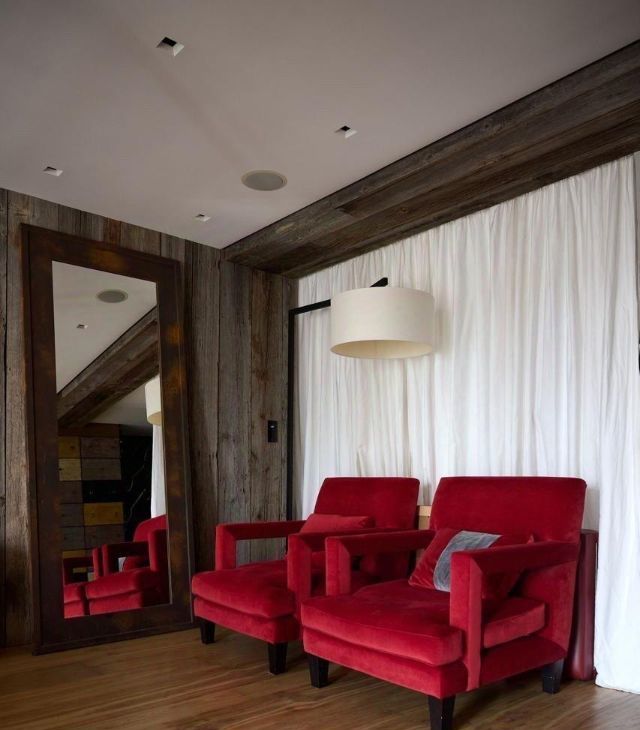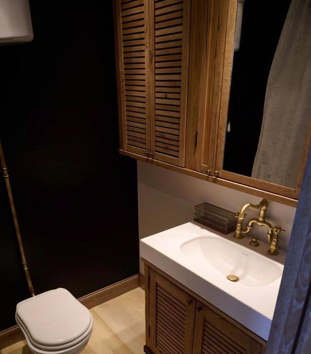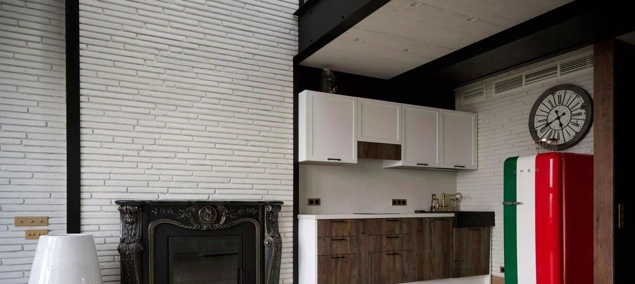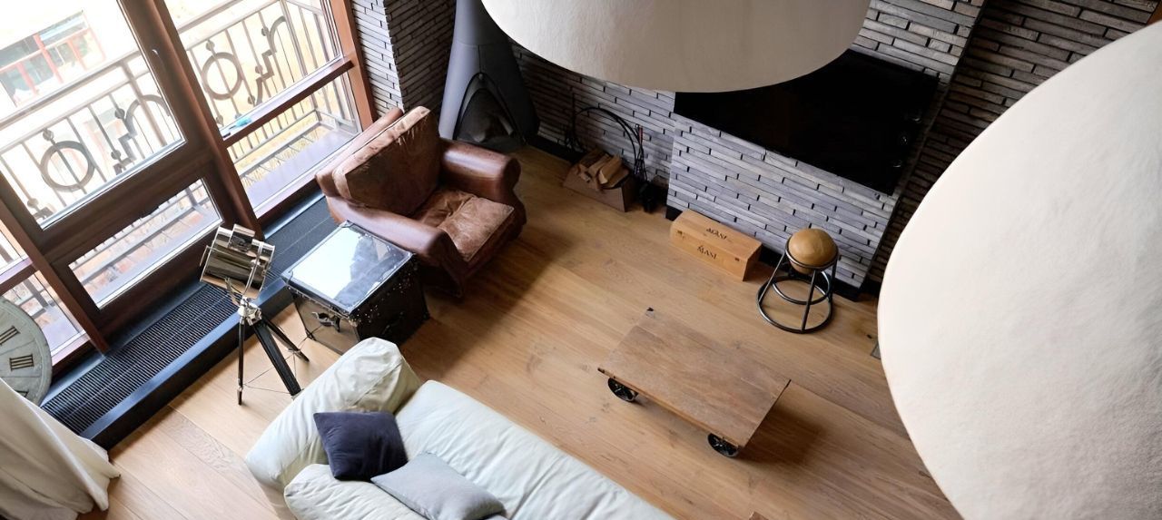 Весь шестиметровый потолок и часть стен отделаны старинной деревянной доской — ощущение аутентичного европейского лофта, перенесённого в центр Москвы.