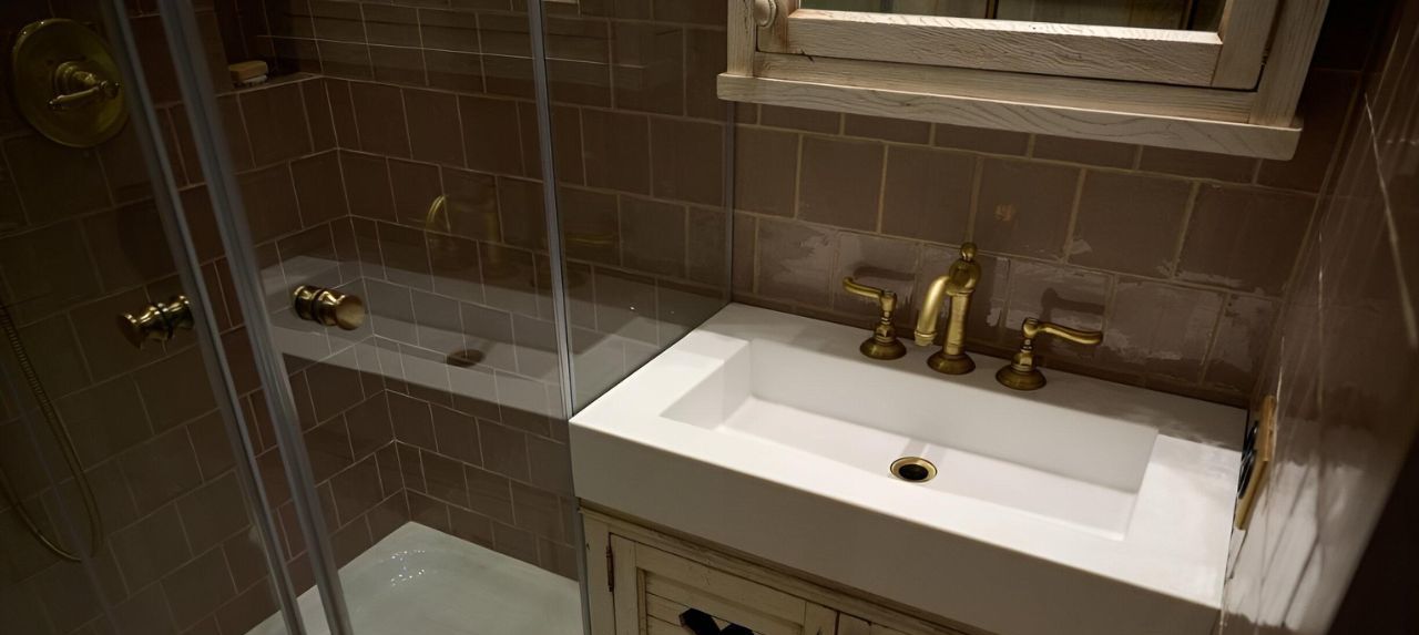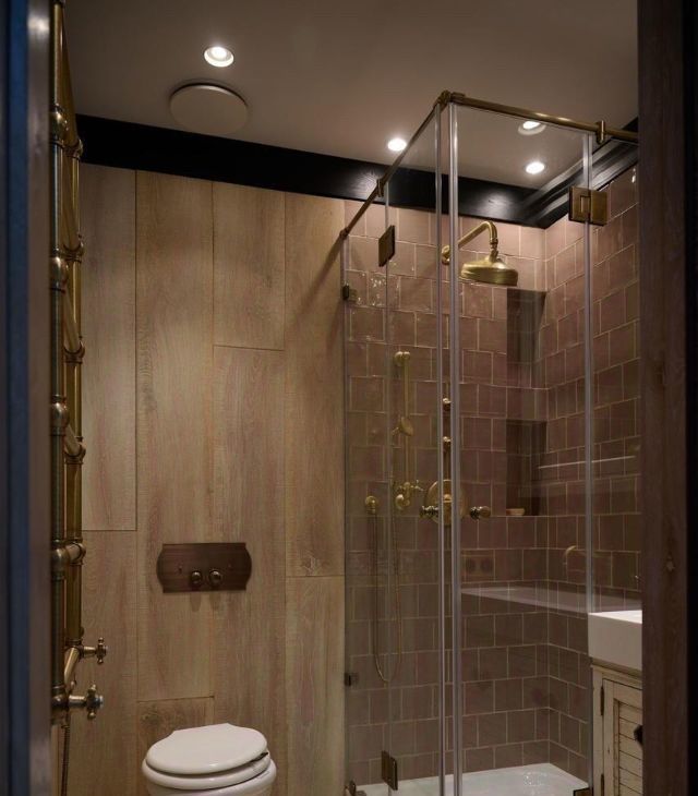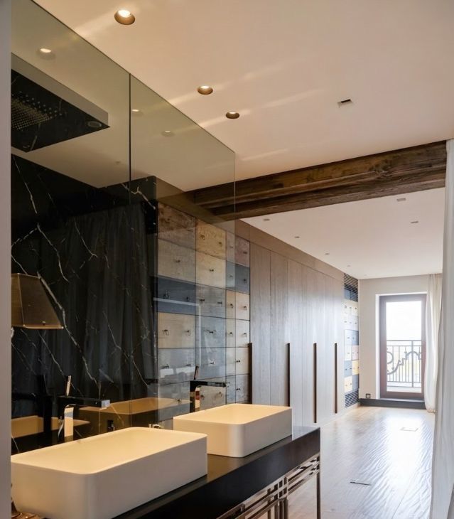 Рядом располагается огромная душевая зона, отделанная панелями внушительного размера из чёрного итальянского мрамора. Контраст чёрного камня, стекла и тёплого дерева создаёт ощущение ещё большей роскоши и архитектурной выразительности.